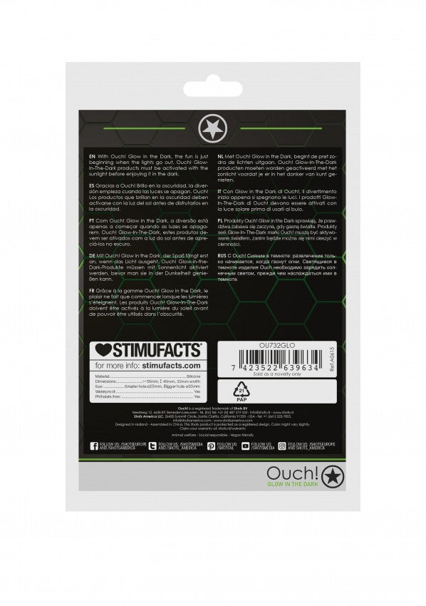Glow-In-The-Dark di Ouch!, il futuro del bondage è qui. Progettato con un'estetica bondage autentica, ma con il piacere aggiunto delle proprietà luminescenti al buio, i dettagli in verde fluorescente trasformeranno ogni evento in qualcosa di unico. Sei pronto per un piacere estremo? Allora devi provare questo anello fallico con cinturino per testicoli! Conferirà al tuo pene la grande forza desiderata mentre fornisce una presa salda attorno allo scroto. Aiuterà anche a prevenire l'eiaculazione precoce. I prodotti Glow-In-The-Dark di Ouch! devono essere attivati con la luce solare prima di usarli al buio.
