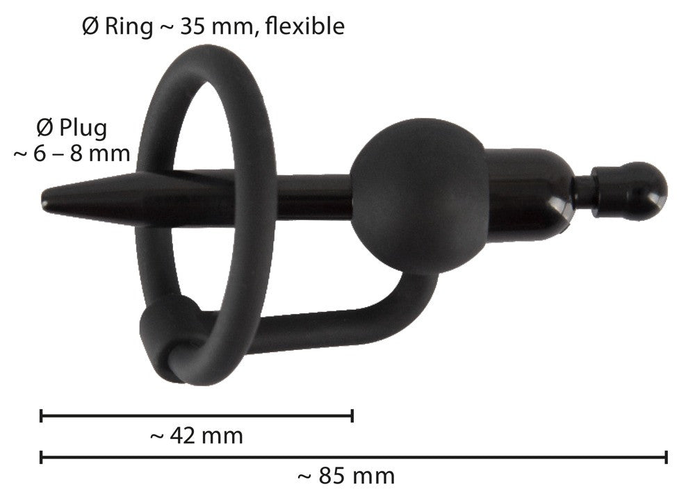 Lunghezza totale 8,5 cm. Lunghezza d'inserimento 4,2 cm. Ø da 0,6 cm a 0,8 cm. Anello Ø 3,5 cm, espandibile. Peso 14 g. Silicone, PU, ABS.