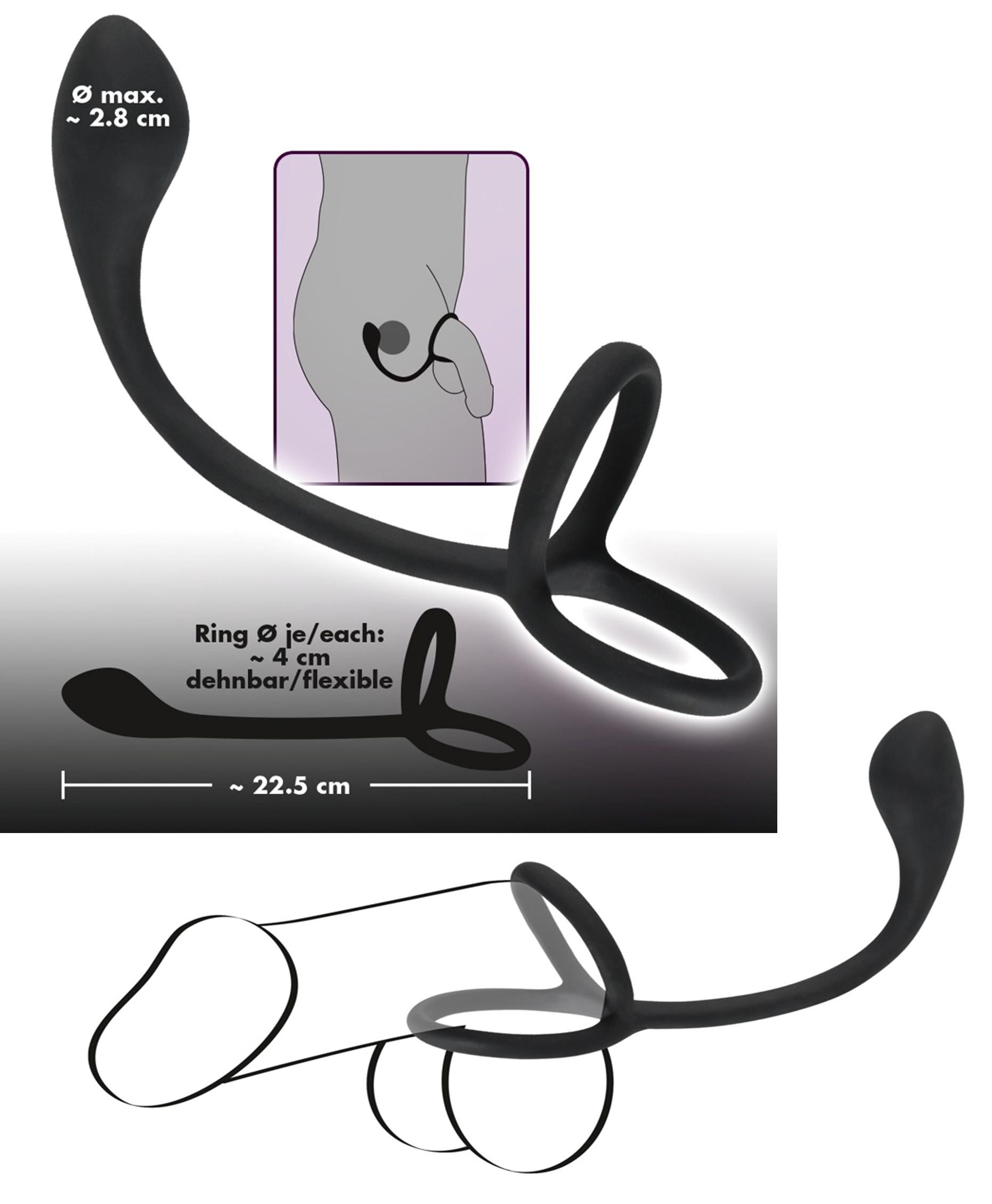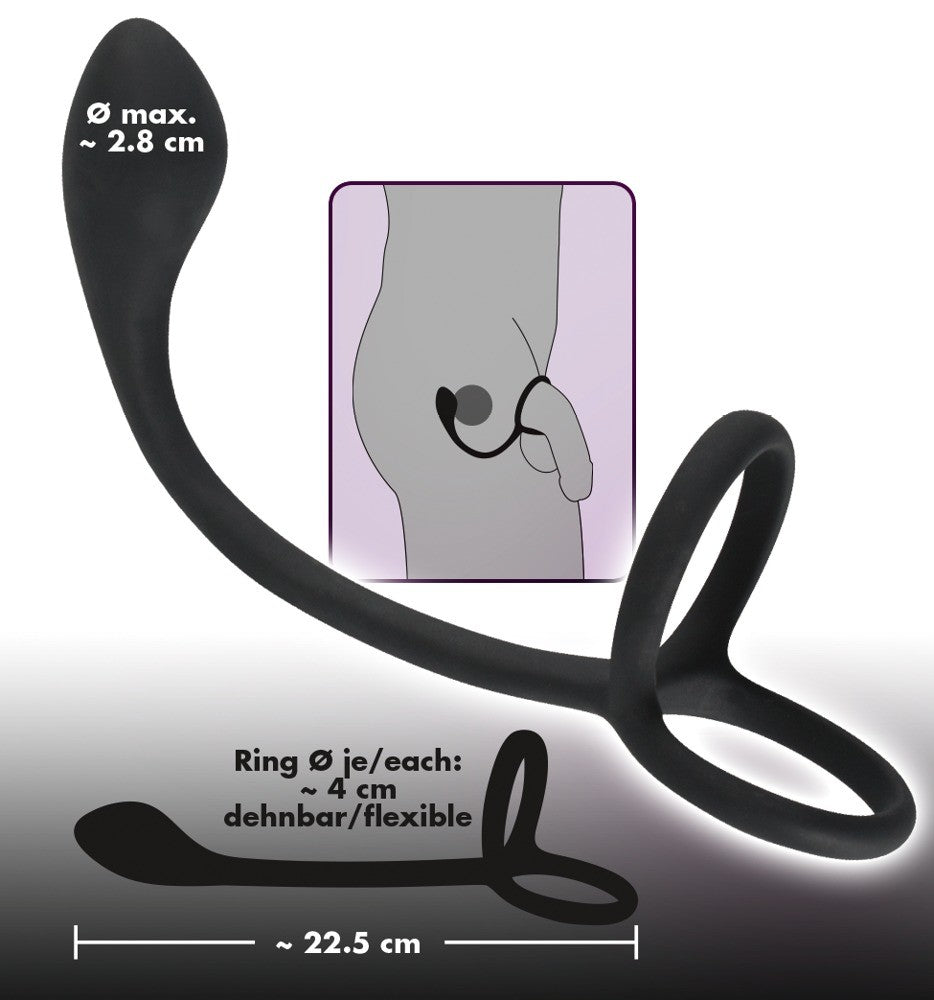 3 in 1: il fallo plug anale con una svolta! Ottieni la triplice stimolazione, perché con questo anello fallico con plug anale nero di Black Velvets,in silicone non solo potrai goderti il tuo un piacere unico , ma è anche bello! Gli anelli integrati sono tirati sul pene e sui testicoli e forniscono un effetto di congestione, che può rendere l'erezione ancora più dura, più forte e, soprattutto, più duratura. Lo stesso plug anale ha una testa ispessita per la stimolazione mirata della prostata, il punto di piacere chiamato P-point dell'uomo. L'asta stretta del tappo di testa scorre agevolmente nel ponte di collegamento all'anello del pene e nell'anello del testicolo e serve anche a stimolare il perineo. Lunghezza totale 22,5 cm. Spina: lunghezza totale 16 cm, profondità di inserimento 6 cm, diametro da 0,8 a 2,8 cm. Anello per pene e testicoli: Ø 4,1 cm (estensibile), spessore del materiale 5 mm. Silicone con rivestimento in PU, privo di ftalati secondo il Regolamento UE 1907/2006 / CE.