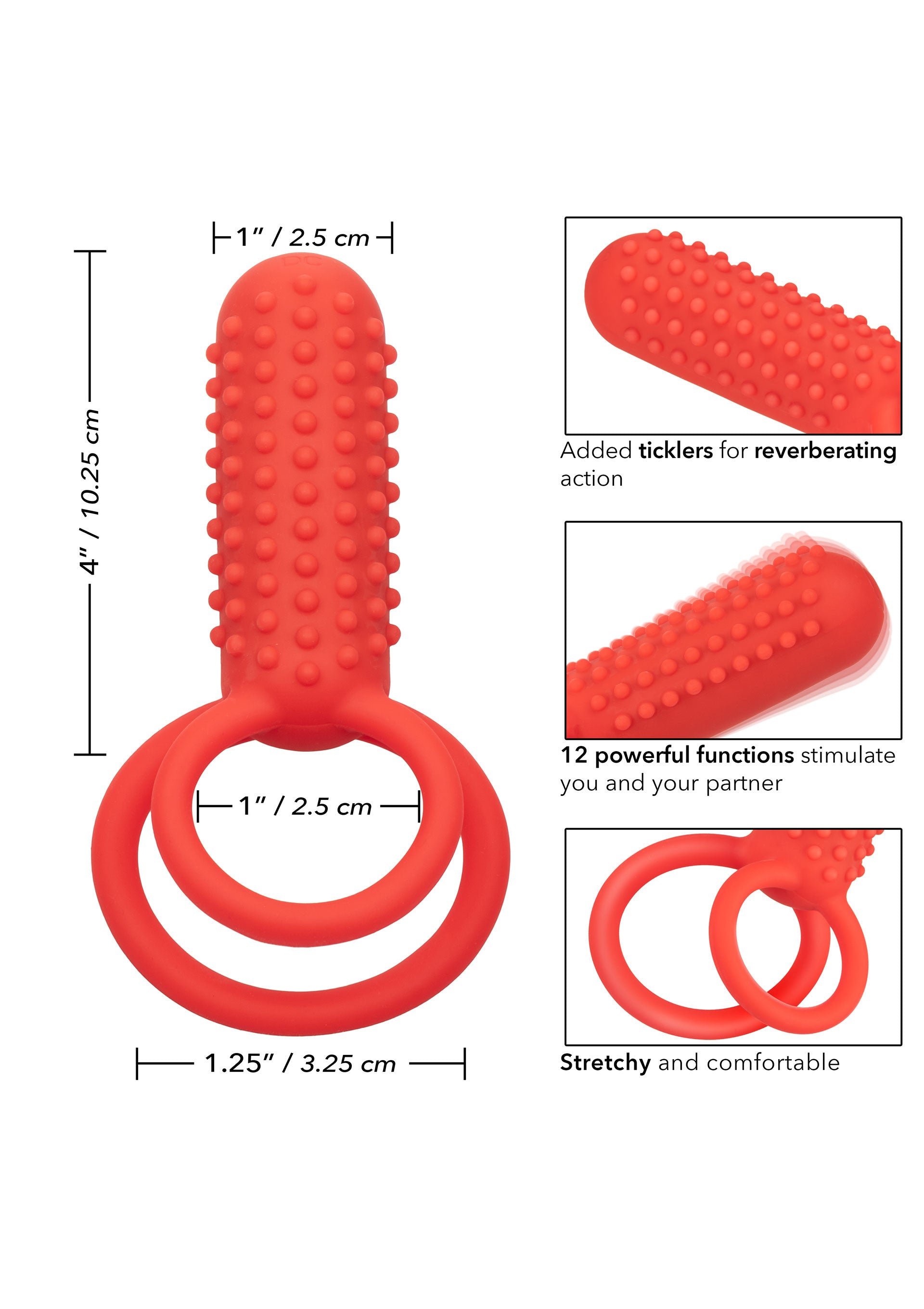 Il CalExotics Silicone Rechargeable Vertical Dual Enhancer combina 12 intense funzioni di vibrazione, un teaser verticale e due anelli di supporto per un piacere potente che fa tremare le ginocchia. Questo anello stimolatore doppio è ideale per i principianti che desiderano rendere le cose più piccanti o per gli esperti di erotismo che vogliono aggiungere un piacere intenso al loro arsenale. L'anello in silicone morbido e sicuro per il corpo migliora la resistenza e la circonferenza per far gemere il vostro amante per avere di più, di più, di più. L'anello doppio stretto massimizza la sensibilità e aumenta le sensazioni, permettendovi di godere di un piacere più lungo e potente. Raggiungete un piacere di livello superiore grazie a 12 funzioni di vibrazione e a uno stimolante teaser nodoso che lascerà entrambi i partner in uno stato di beatitudine orgasmica. Fate un tuffo in questo anello impermeabile e godetevi le potenti vibrazioni ovunque vogliate bagnarvi. Questo appassionato anello per il cazzo doppio ricorda esattamente come vi piace grazie a un chip di memoria all'avanguardia ed è in grado di riconoscere l'ultima funzione utilizzata. Ricaricate il vostro piacere in un attimo con un tempo di ricarica di 1,5 ore e godetevi fino a 80 minuti di gioco.