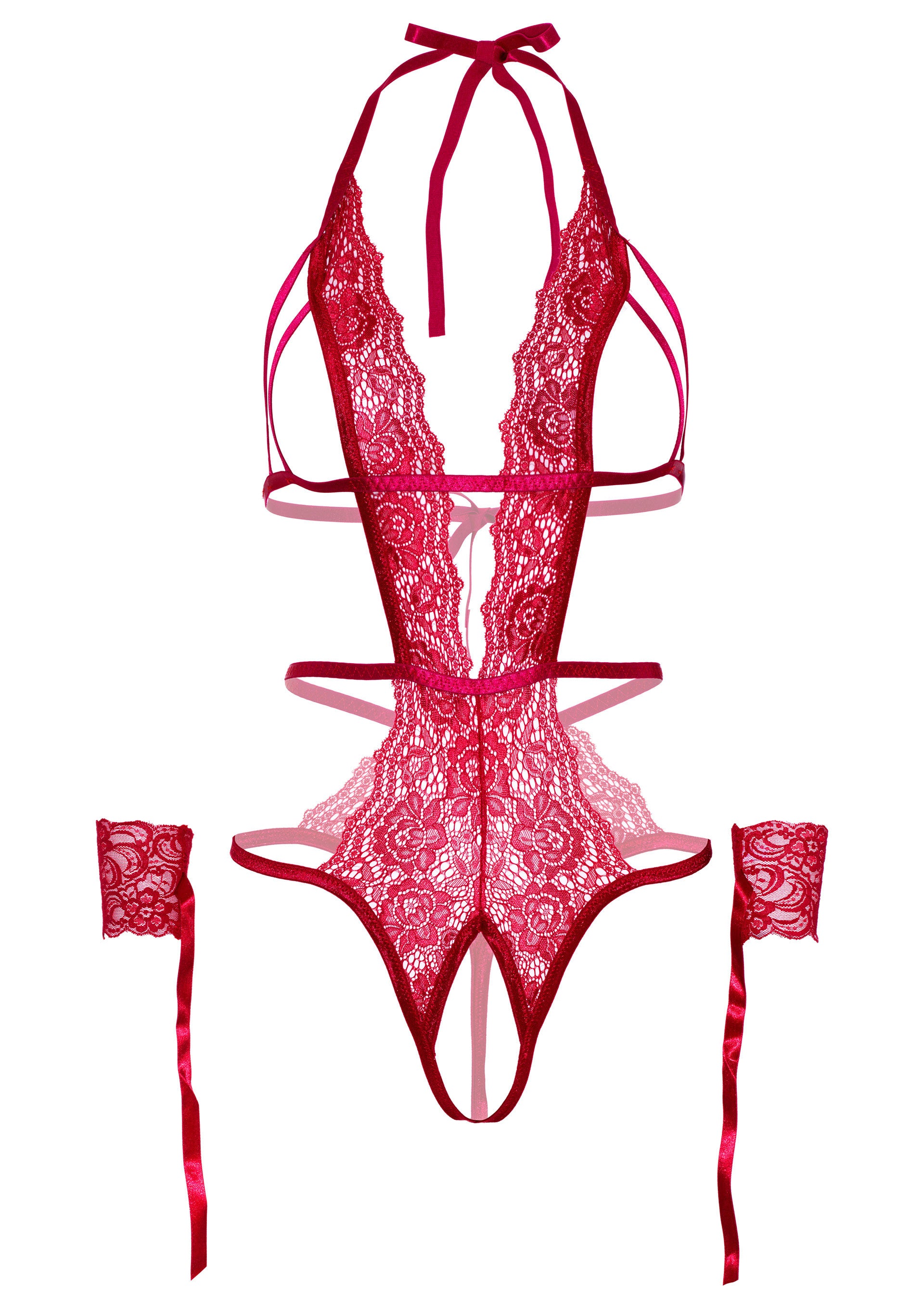 2 pezzi di orsacchiotto di pizzo senza cavallo con cinturino a gabbia con perizoma sul retro e coppa aperta, cinturini posteriori e polsini contenitivi.