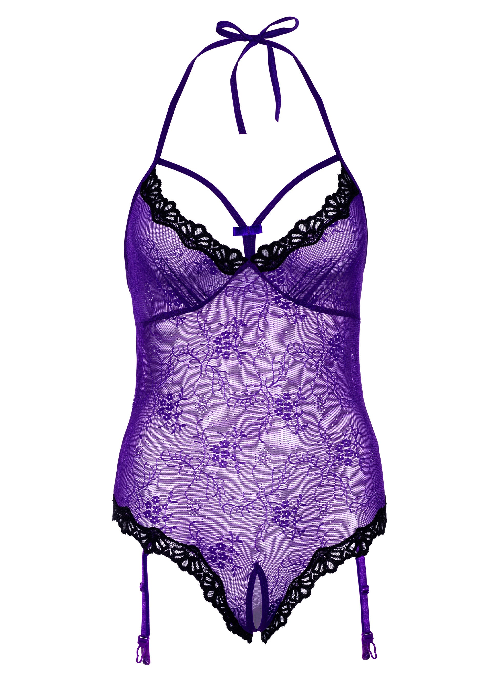 Teddy in pizzo con cavallo aperto - Body birichino con cavallo aperto con reggicalze regolabile. Delicato pizzo floreale, dettaglio di fiocco in raso e spalline elastiche per la cavezza per la migliore vestibilità.