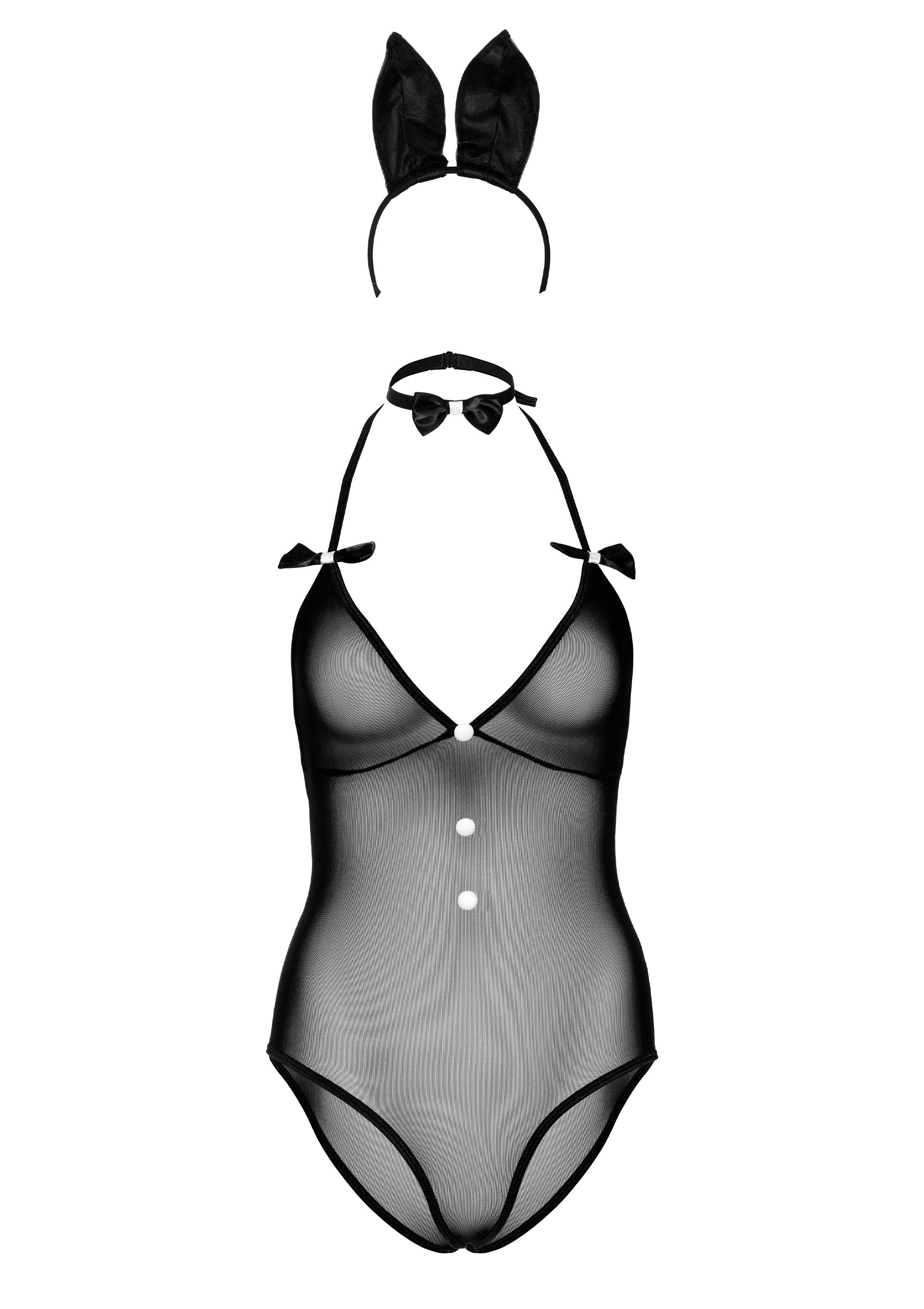 Classic Bunny Roleplay Set - Set Play-Bunny per il gioco di ruolo, che include un body con cavezza in morbida rete trasparente con dettagli di papillon e bottoni in stile smoking. Collare elastico con papillon e copricapo con orecchie da coniglio inclusi.
