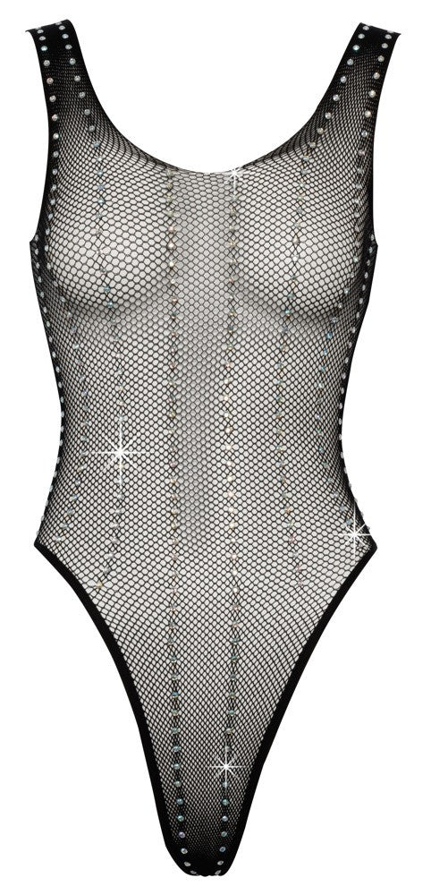 Body tuttofare di Cottelli FANTASY, realizzato in rete fine e morbida con finiture di strass a righe verticali. Uno stile semplicemente bellissimo, con aperture extra alte sulle gambe che mettono in mostra il sedere e le gambe in modo eccitante. Tutti senza cuciture ed elasticizzati per un elevato livello di comfort.