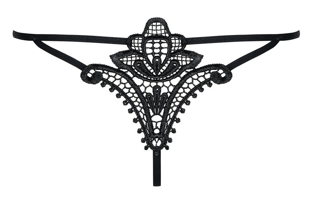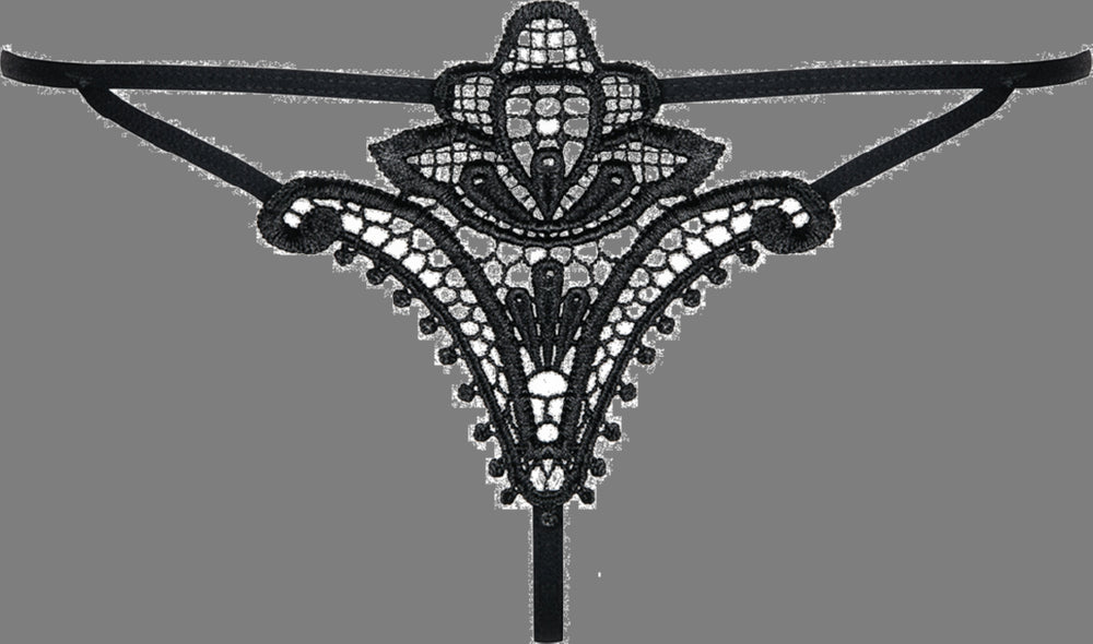 String con un fronte semplice, elastici sul lato e ricamo a filigrana sul retro. Nero. 94% poliammide, 6% spandex.
