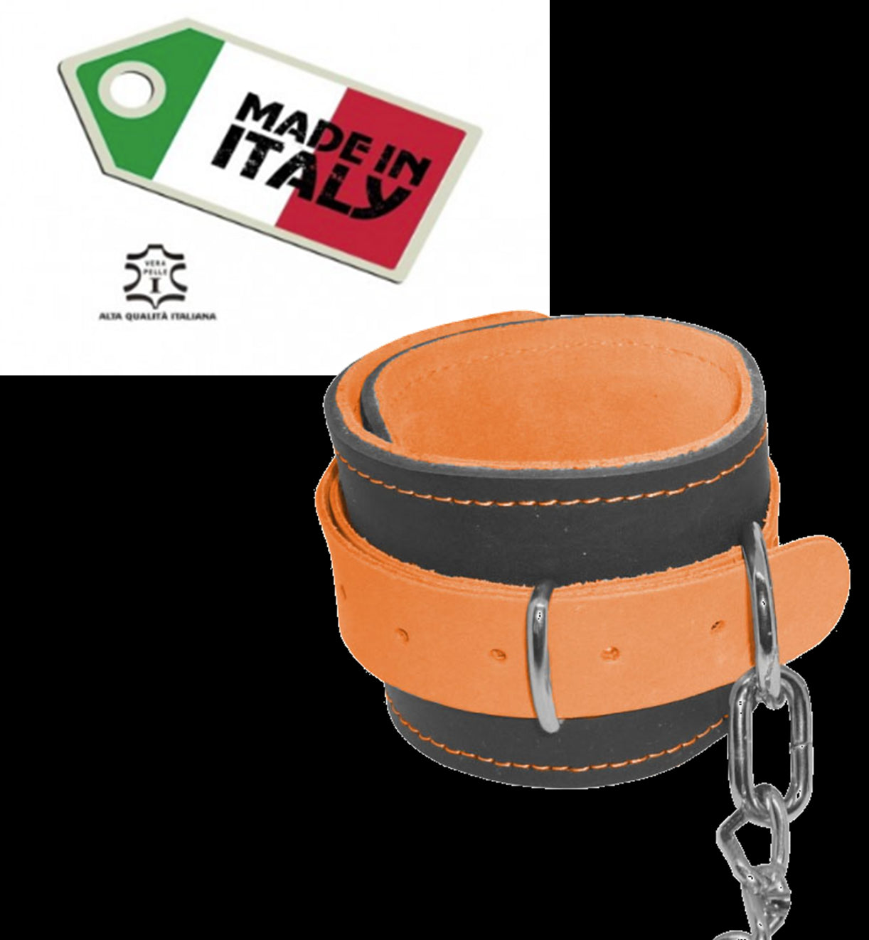 Cavigliere in vera pelle (con interno scamosciato per un maggior comfort)con catena ritorta in ferro nichelato. Prodotto artigianale 100% Made in Italy.