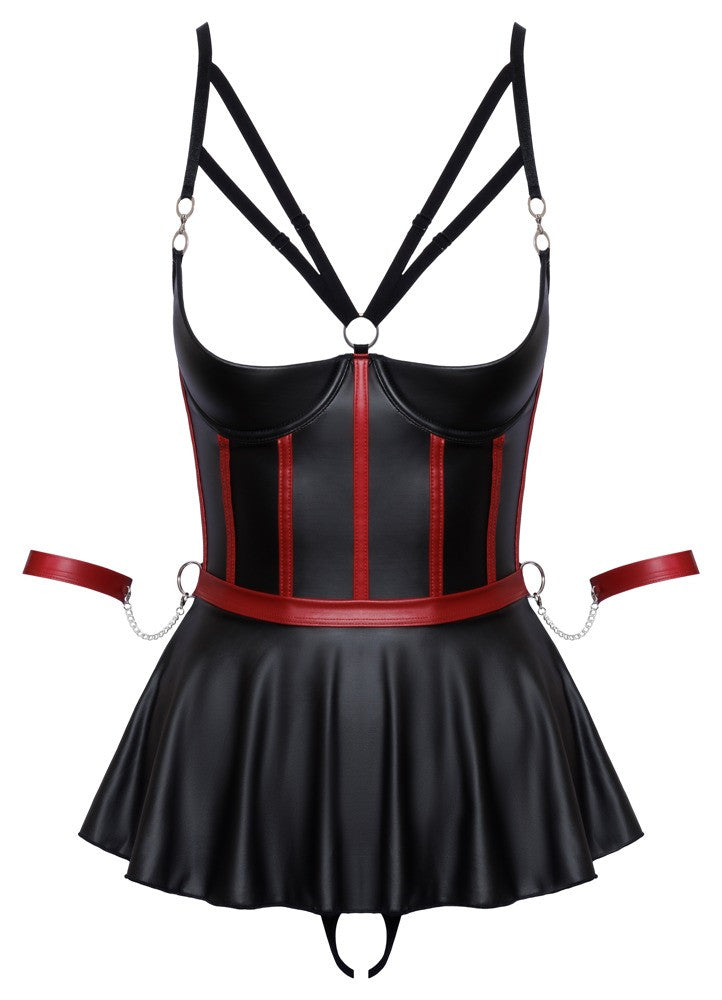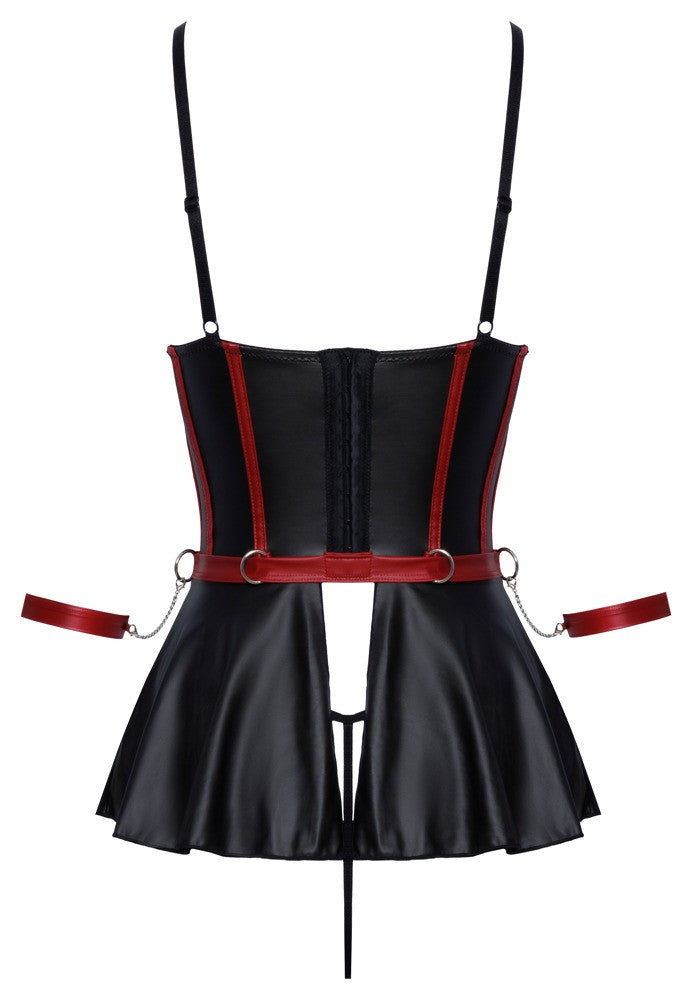 Orlo lungo con balza, perizoma inguinale e 2 polsini da braccio in un set di Cottelli BONDAGE. In un nobile look nero opaco con strisce rosse a contrasto in un corpetto che accentua la vita e dettagli color argento. Il corpetto longilineo con coppe leggermente imbottite con ferretto solleva perfettamente il seno e lo presenta in modo offensivo incorniciato da spalline elastiche. La gonna a balze, aperta sul retro, gioca sensualmente sui fianchi. Le spalline sul davanti sono impreziosite da elementi gioiello che attirano l'attenzione. Le spalline, le fasce del décolleté e la chiusura a gancio sul retro sono regolabili. In vita, un totale di 4 anelli per i due polsini morbidi per le braccia con catene a moschettone. I polsini sono regolabili con chiusure in velcro. Il piccolo perizoma abbinato è invitantemente aperto sul cavallo.