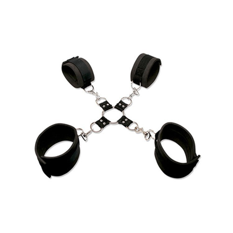 Magnifico costrittivo con polsiere e cavigliere uniti tra loro da un anello con quattro agganci, potrete in questo modo incastrare e bloccare gli arti del Vostro partner come meglio preferite. Le polsiere e le cavigliere sono regolabili cosi' da essere adattati a tutte le misure. Grazie a questo costrittivo potrete mettere in atto tutte le pratiche del bdsm senza ausilio di corde e nodi. Nella confezione troverete inoltre una mascherina copri occhi nera in raso che rendera' ancora piu' accattivanti e trasgressive le vostre notti di passione.