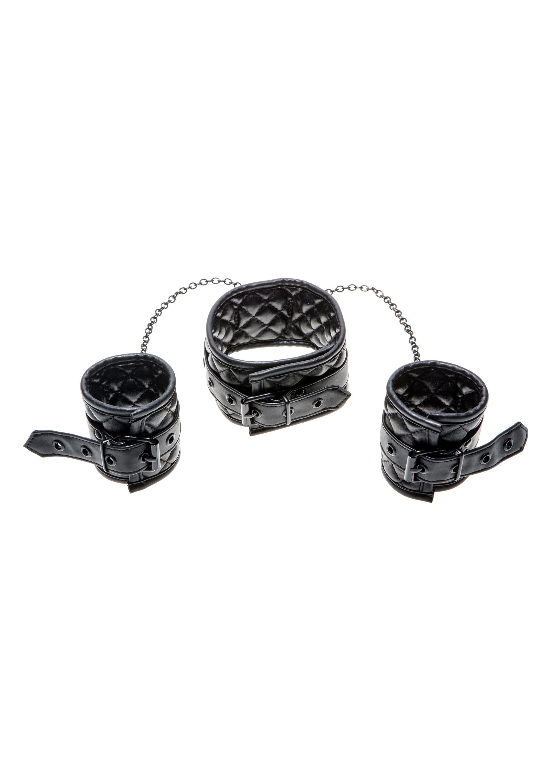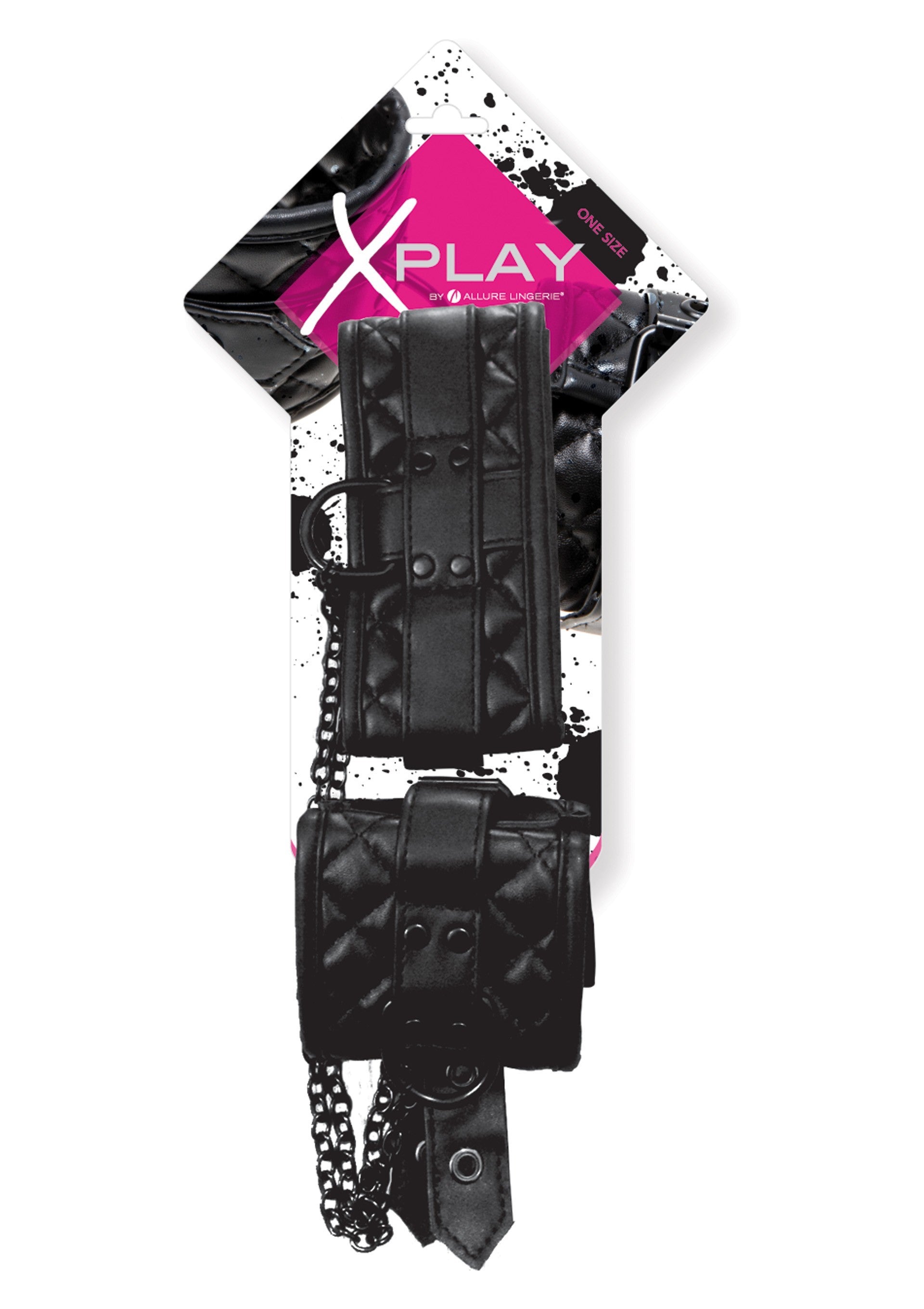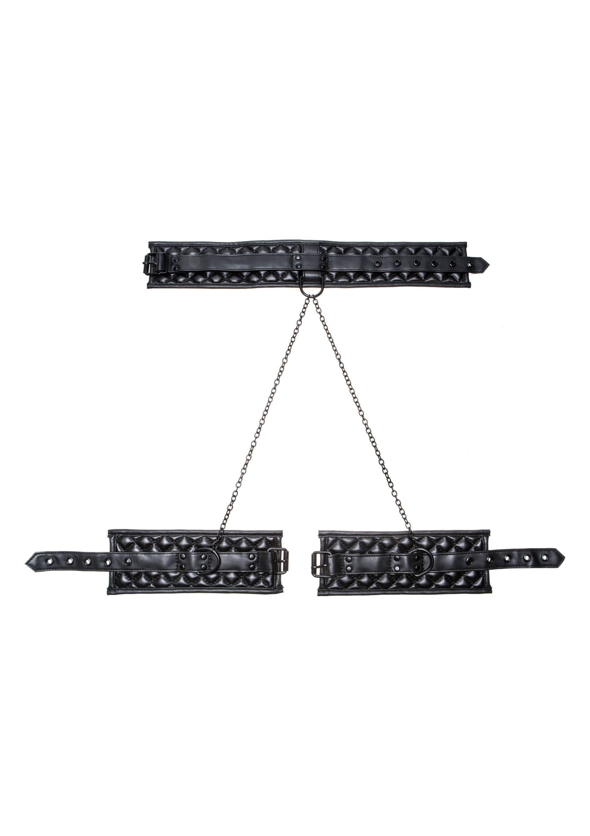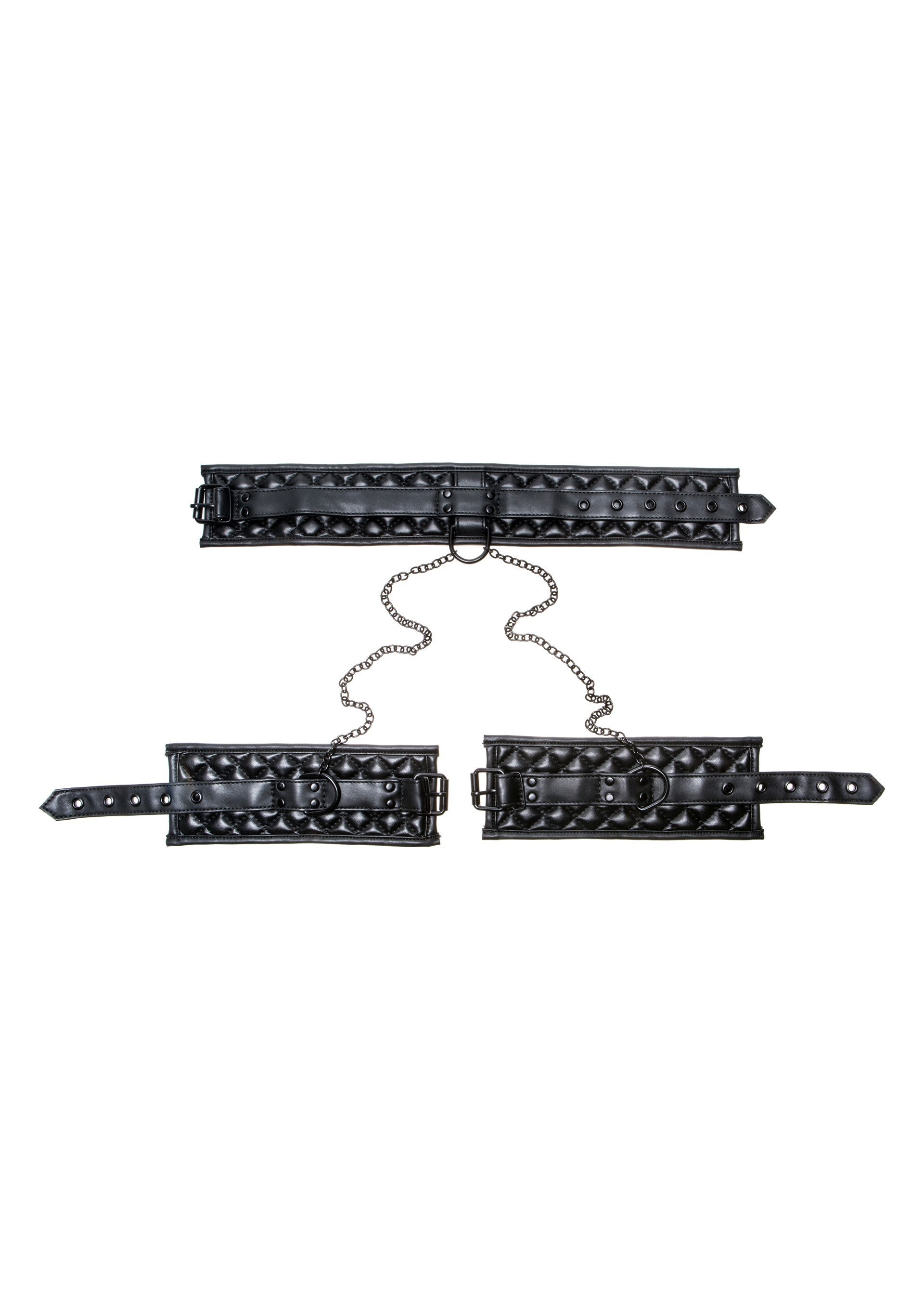 Il collare più polsini X-Play sono accessori BDSM di qualità realizzati in PVC di alta qualità. I polsini hanno un motivo trapuntato, che conferisce loro un tocco unico e alla moda. Il design presenta cinturini regolabili con cintura, che lo rendono un prodotto unico per tutti. Il colletto e i polsini sono fissati da un robusto, ma elegante catenella in metallo. Il collare e i polsini fetish presentano una confezione colorata e moderna con dettagli rosa caldo.