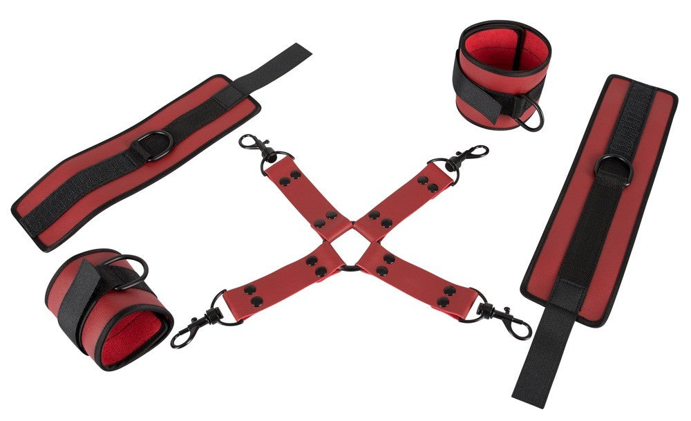 Set di fermi per mani e piedi (velcro) con croce imitazione pelle con anello (attacco moschettone). Rosso / Nero. Poliuretano, metallo, crosta di pelle, senza ftalati secondo il Regolamento UE 1907/2006 / CE.