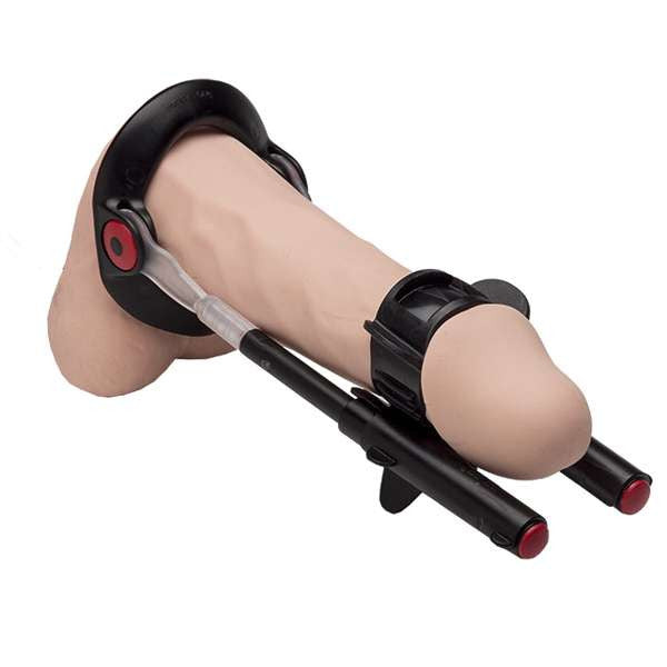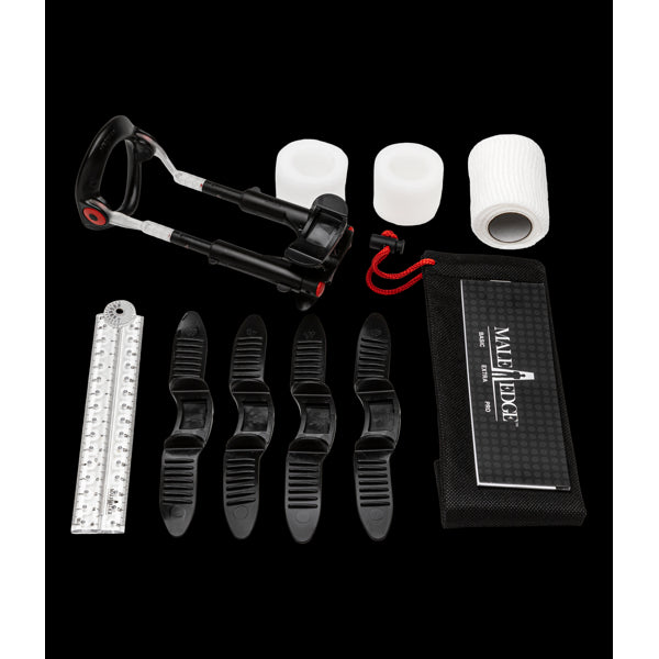 Espansore per un ingrandimento del pene indolore. Adatto per una lunghezza del pene di 4-24 cm. Con video esplicativo online e accesso a un forum. Con diario di formazione e righello per registrare i successi. Compresi 4 anelli di gomma aggiuntivi, 2 tamponi di protezione e una benda.