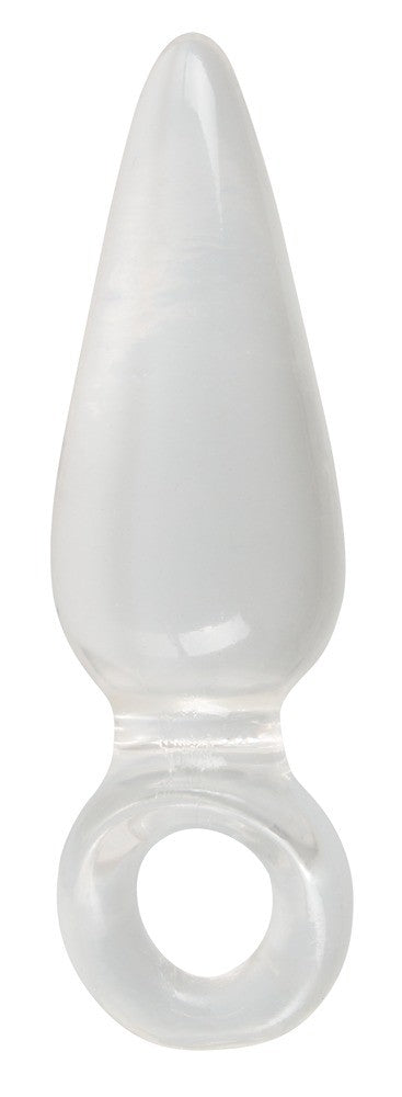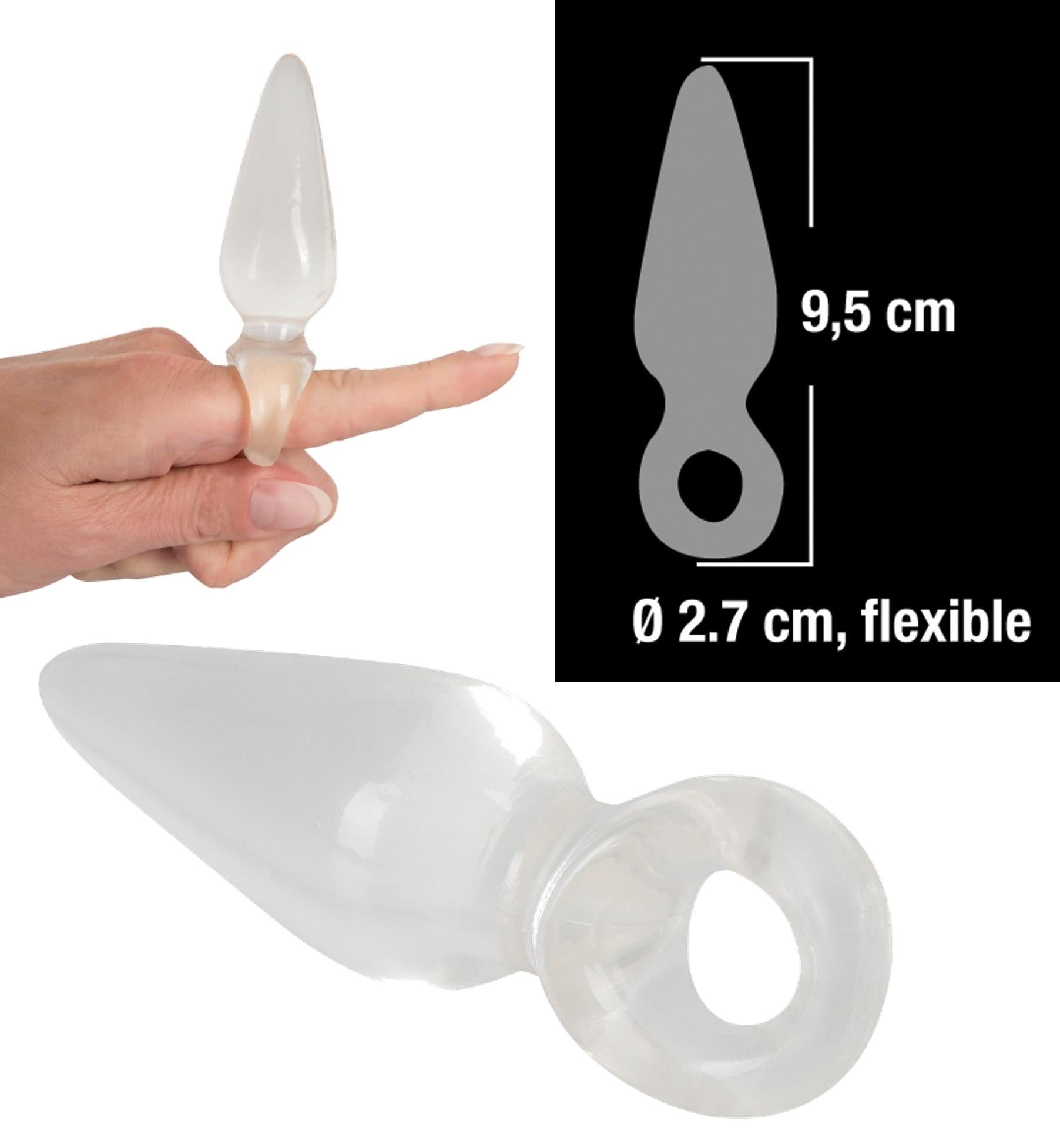 Fallo anale plug finger plug anal dildo con superficie lisciacon anello per dito. Trasparente. Lunghezza totale 9,5 cm, profondità 7 cm, Ø 2,7 cm. materiale: TPR, prifo ftalati in conformità UE al regolamento 1907/2006/CE.