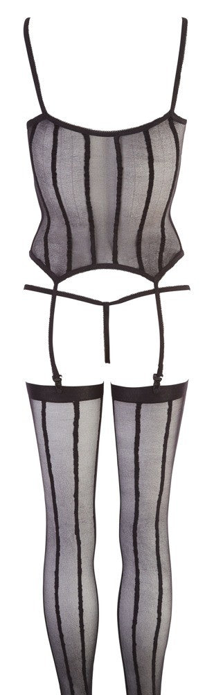 Set erotico Guepiere Catsuit nero velato composto da top con reggicalze, perizoma e calze. Con righe verticali nere.Realizzato in Poliammide in taglia unica dalla S alla L