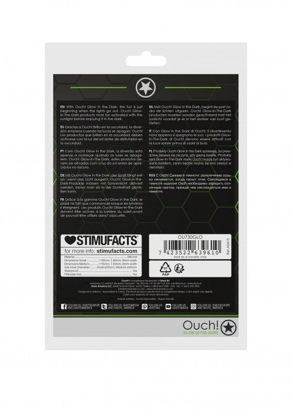 Glow-In-The-Dark di Ouch!, il futuro del bondage è qui. Progettato con un'estetica bondage autentica, ma con il piacere aggiunto delle proprietà luminescenti al buio, i dettagli in verde fluorescente trasformeranno ogni evento in qualcosa di unico. Questo set di anelli fallici contiene due anelli di dimensioni comode ed elastici. Gli anelli miglioreranno le tue prestazioni sessuali e ti offriranno tantissime possibilità grazie alla loro flessibilità. I prodotti Glow-In-The-Dark di Ouch! devono essere attivati con la luce solare prima di usarli al buio.