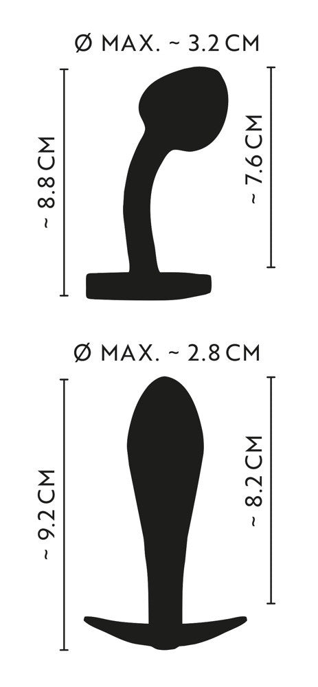 Due arcobaleni per la felicità anale! Metal Butt Plug Set in Rainbow Colors di ANOS con 2 plug anali di metallo in scintillanti colori arcobaleno. Uno ha una classica forma conica, l'altro è leggermente curvo con una punta a forma di punto P. Entrambi sono lisci e senza cuciture e hanno un ampio ancoraggio/stop per una manipolazione sicura senza scivolare. Questo rende possibile indossare i tappi di metallo piacevolmente pesanti per periodi di tempo più lunghi. La classica spina dritta è inoltre decorata con una pietra preziosa blu nell'ancora. Le spine di metallo sono anche perfette per il gioco della temperatura: Basta metterli in frigo a raffreddare o in un bagno d'acqua per riscaldarli. Spina dritta: lunghezza totale 9,2 cm, lunghezza d'inserimento 8,2 cm, Ø max. 2,8 cm. Peso 81 g. Spina curva: lunghezza totale 8,8 cm, lunghezza d'inserimento 7,6 cm, Ø max. 3,2 cm. Peso 75 g. Metallo, acrilico.