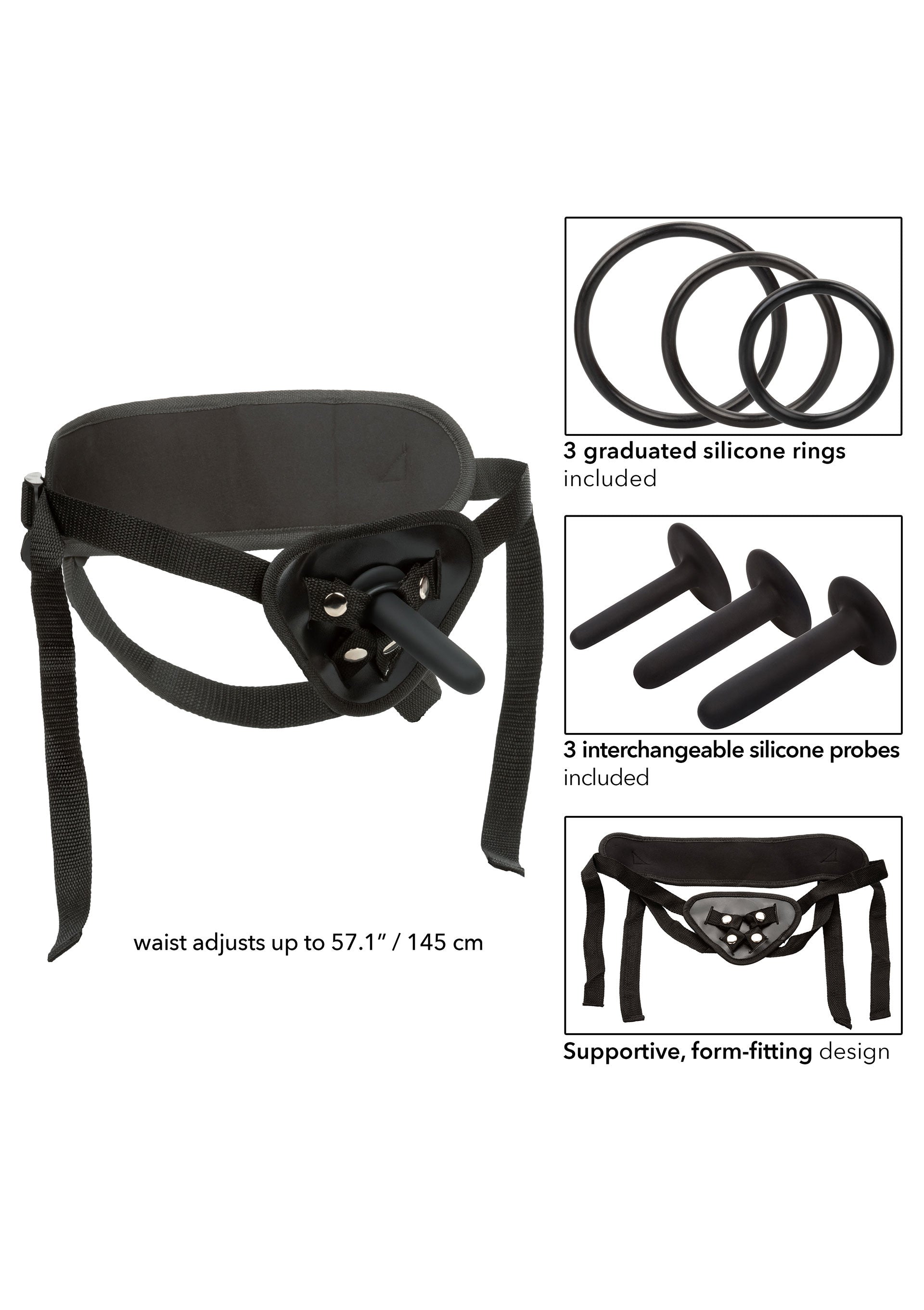 Il kit per il pegging in silicone di Boundless è stato creato per farvi entrare nell'eccitante mondo del piacere senza fine. Questo set per il piacere anale è fatto per giocare con 3 misure graduate di sonde per pegging, un'imbracatura universale e 3 misure graduate di anelli di supporto. Le sensuali sonde in silicone sono realizzate per aumentare il piacere con 3 misure graduate per facilitare i brividi della passione anale. Cambiate facilmente la misura della sonda con il set di 3 anelli intercambiabili per adattarla a qualsiasi dong, dildo o harness toy Boundless. Rimanete comodi anche durante i giochi di piacere più vigorosi grazie alla vestibilità universale, alle cinghie completamente regolabili su cosce e vita e alla fascia posteriore di sostegno. Abbracciate il gioco disinibito, il piacere sfrenato e lasciate che le vostre fantasie si scatenino con questo set di imbracatura e sonda.