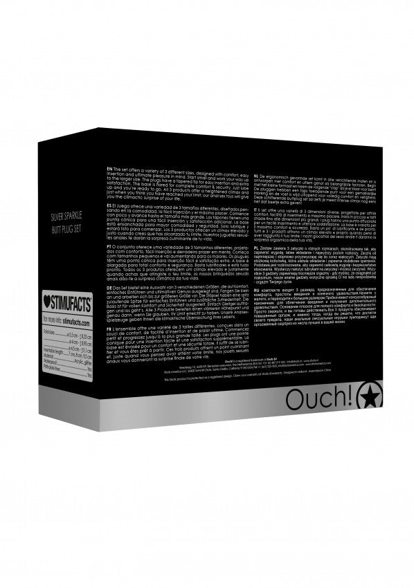 Questo scintillante set di plug è pronto per darti tanto piacere. Inizia in piccolo e fatti strada fino alle dimensioni più grandi. I plug hanno una punta affusolata per un facile inserimento e ulteriore soddisfazione. La base è svasata per il massimo comfort e sicurezza. Basta un po' di lubrificante e sie pronto.