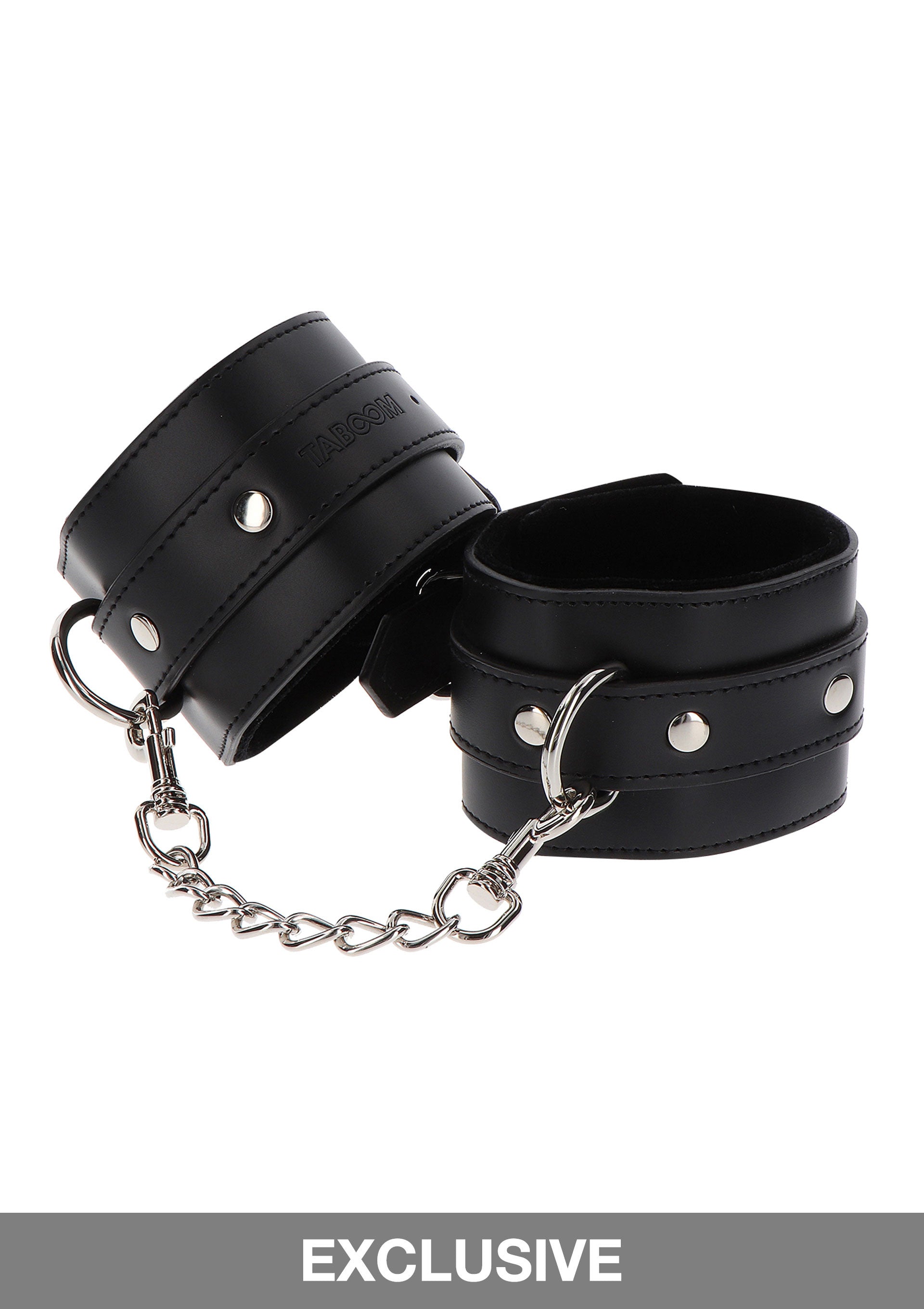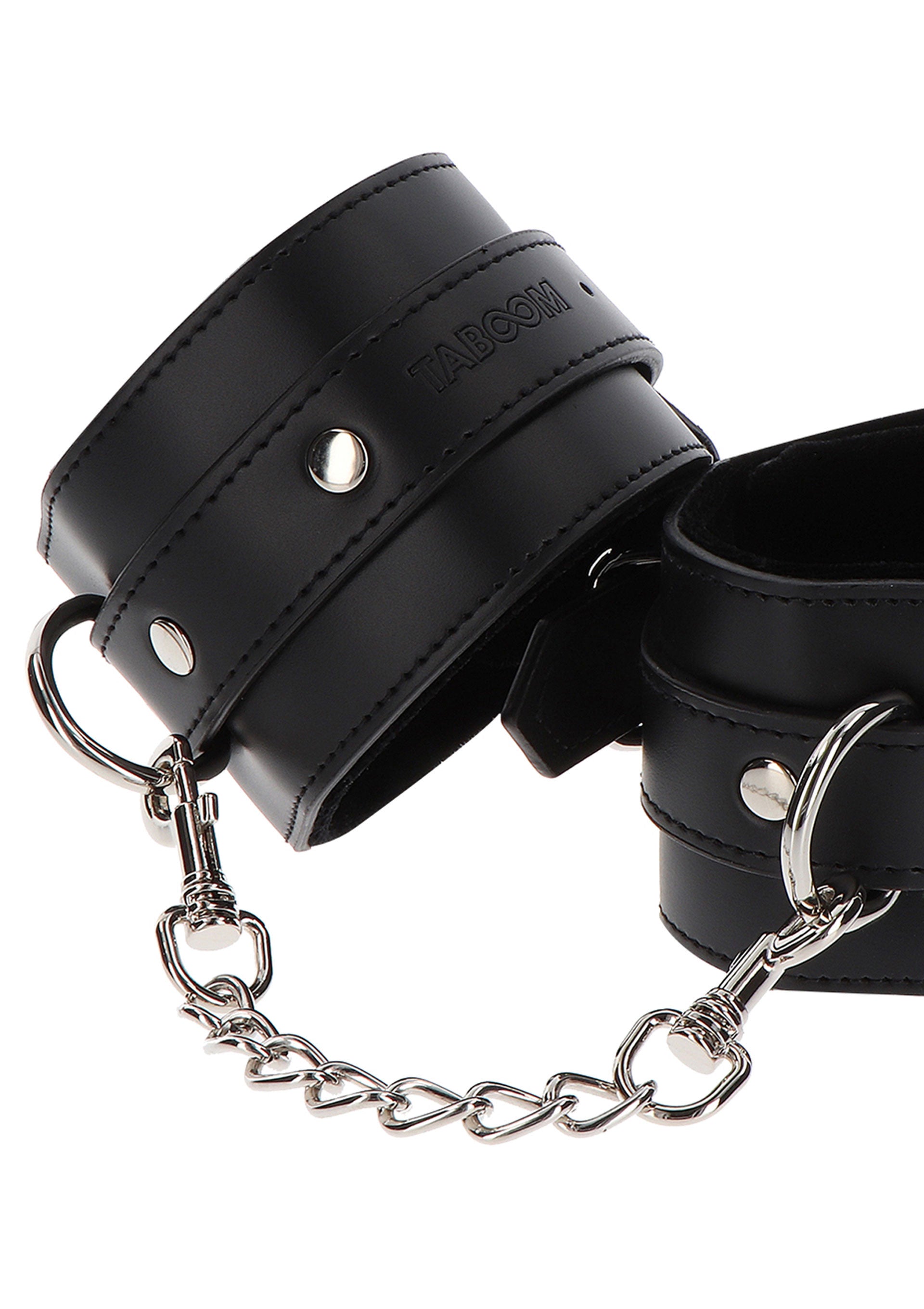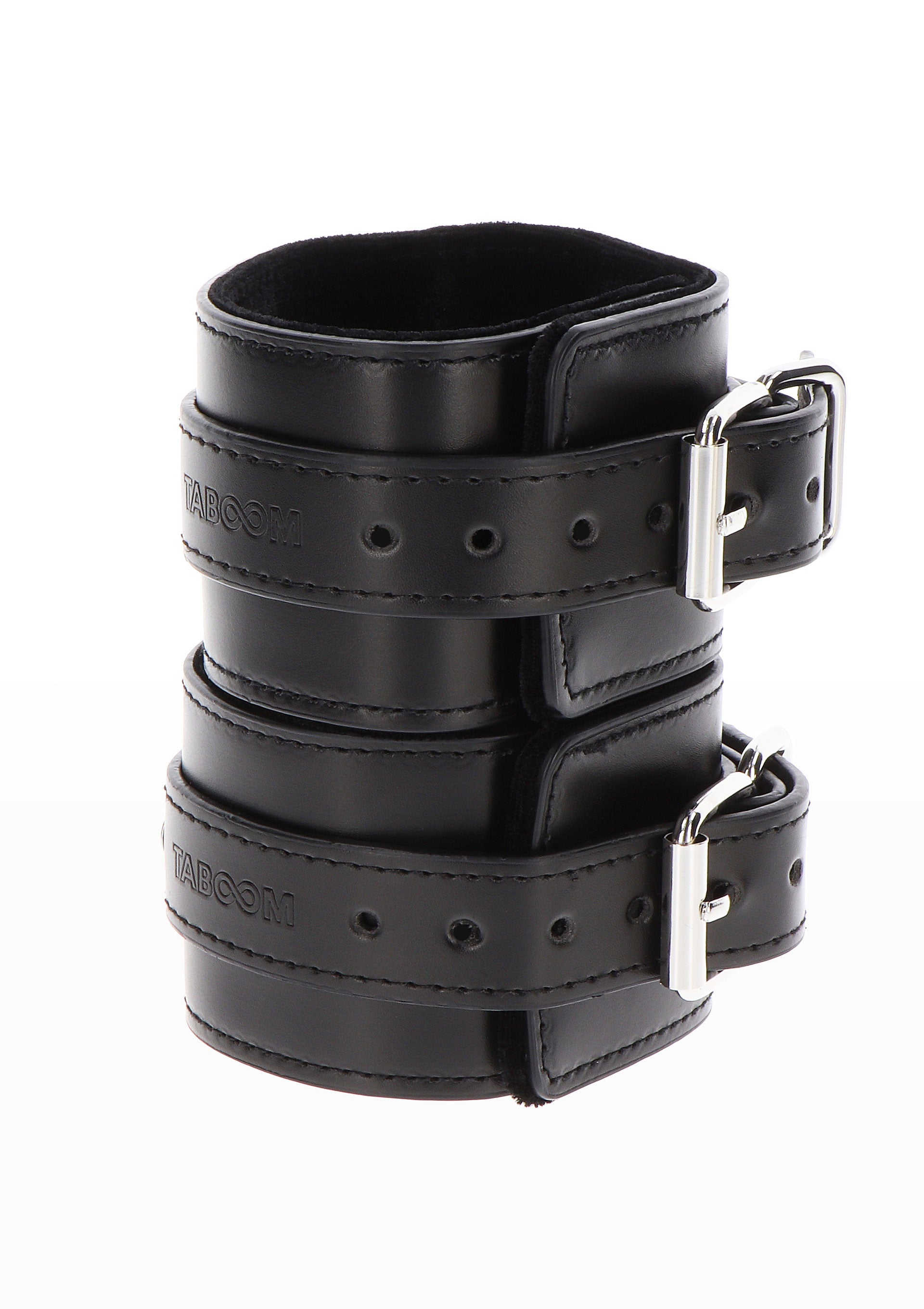 I polsini regolabili TABOOM di alta qualità sono pratici e resistenti. Goditi una buona sessione di bondage o indossalo come accessorio sexy. Le manette robuste e sicure sono rivestite in lussuoso velluto per prevenire irritazioni cutanee, rendendole comode da indossare. Questi polsini TABOOM in pelle vegana non si arrendono. Utilizzi le robuste clip e gli anelli a D per legare le manette l'una all'altra o, ad esempio, alle colonne del letto.