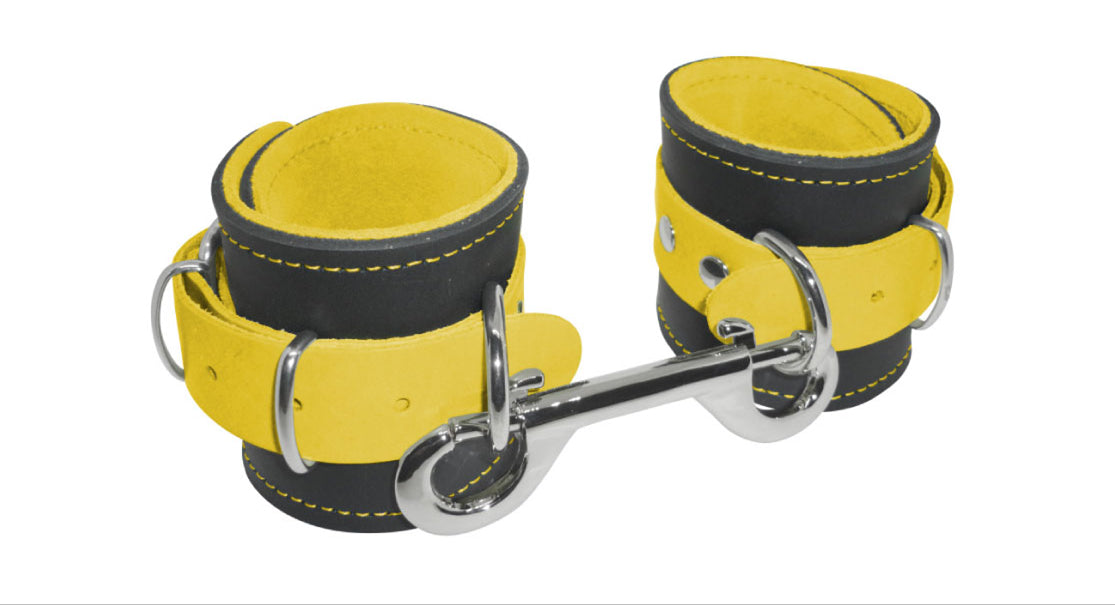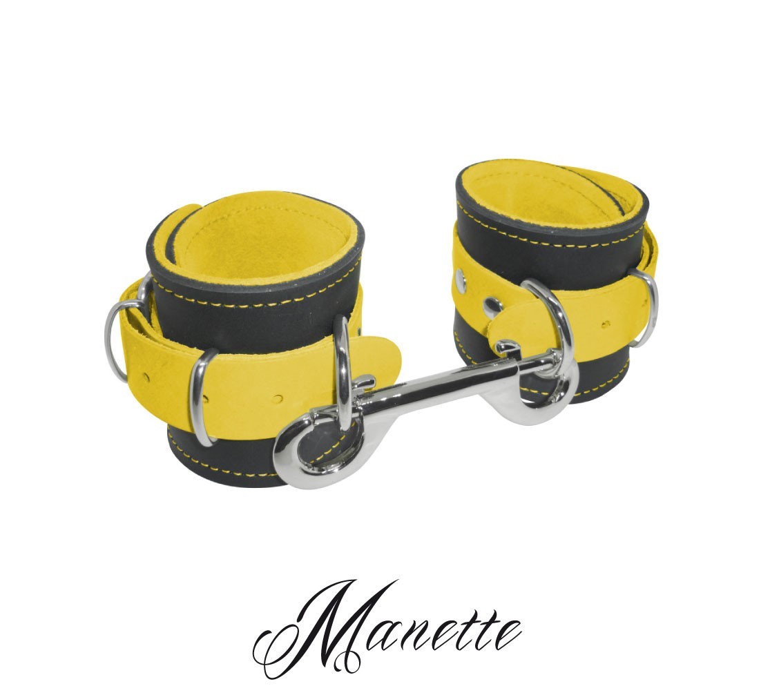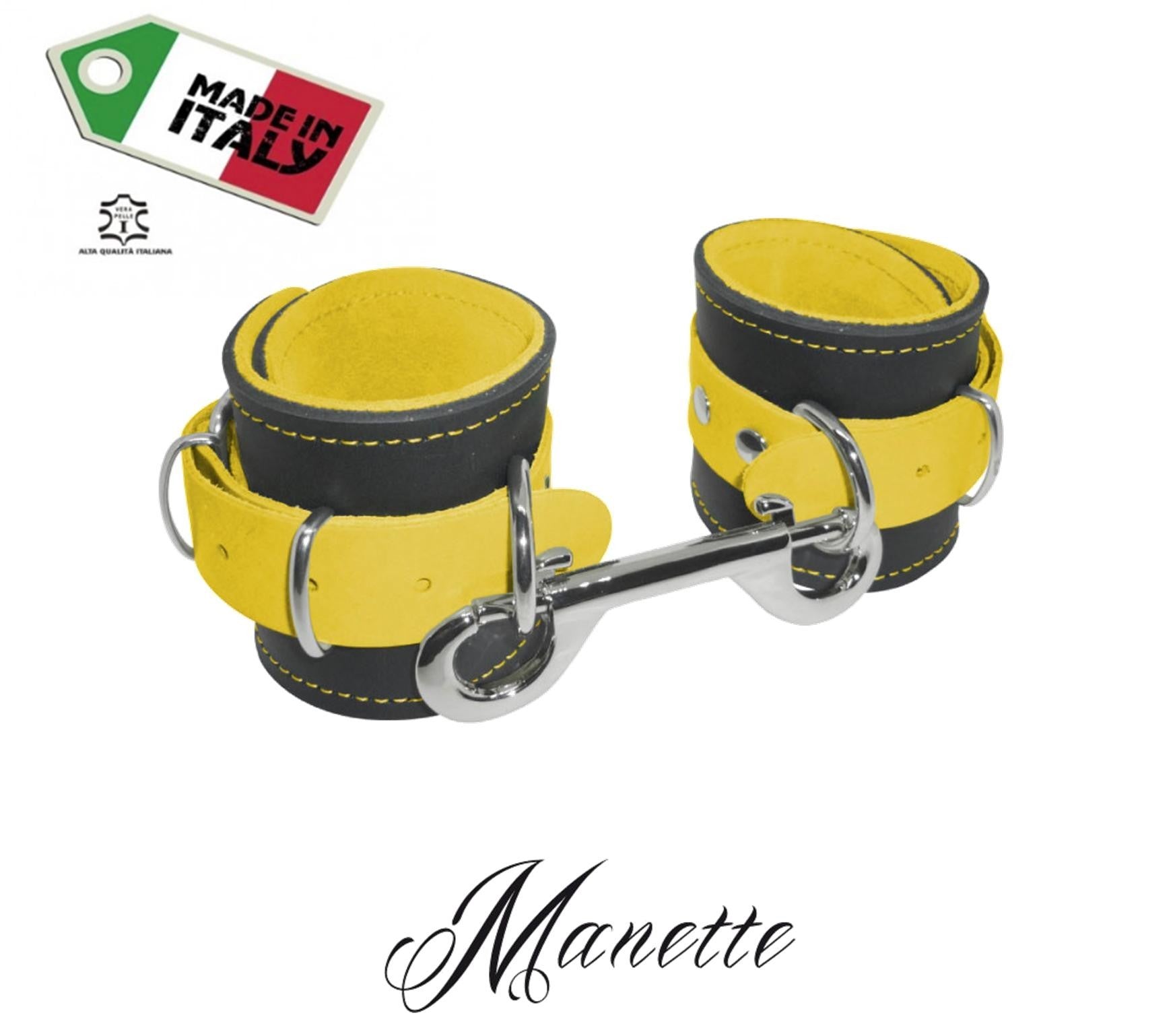 Manette in vera pelle (con interno scamosciato per un maggior comfort)unite da un moschettone doppio in ferro nichelato. Prodotto artigianale 100% Made in Italy.