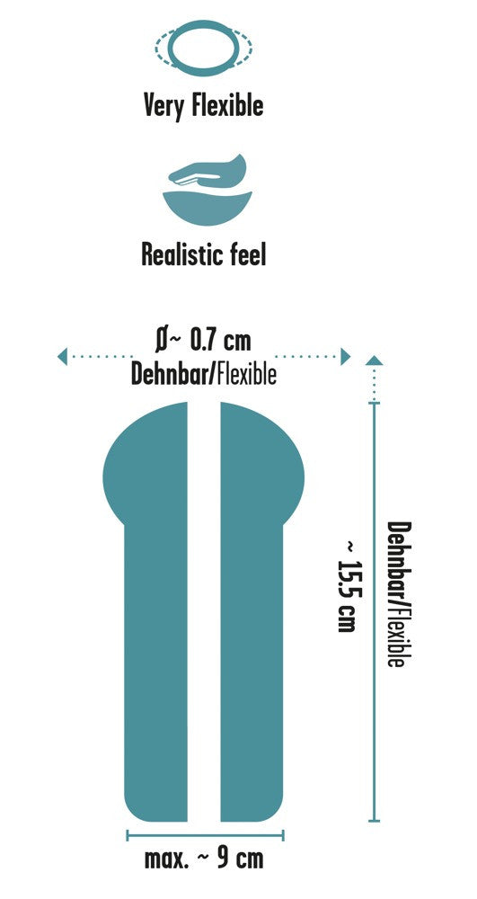 Lunghezza totale 15,5 cm, Ø esterno 7 cm, Ø interno stretto ed elastico. TPE.
