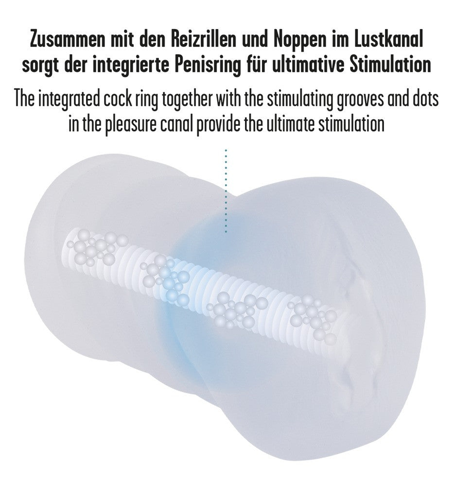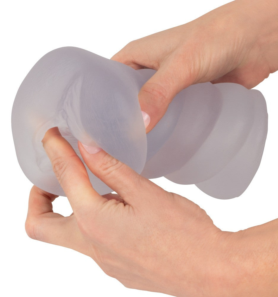 Masturbatore trasparente in look vagina. Il masturbatore elastico fatto di materiale simile alla pelle è dotato di scanalature e nodi di stimolazione distintivi all'interno, che forniscono un massaggio intenso ed efficace per l'orgasmo durante l'handjob. L'anello elastico per il pene integrato all'interno prende il pezzo migliore bello e stretto nella pinza per una sensazione di presa intensa. Il masturbatore è anche aperto sul retro per una facile pulizia.