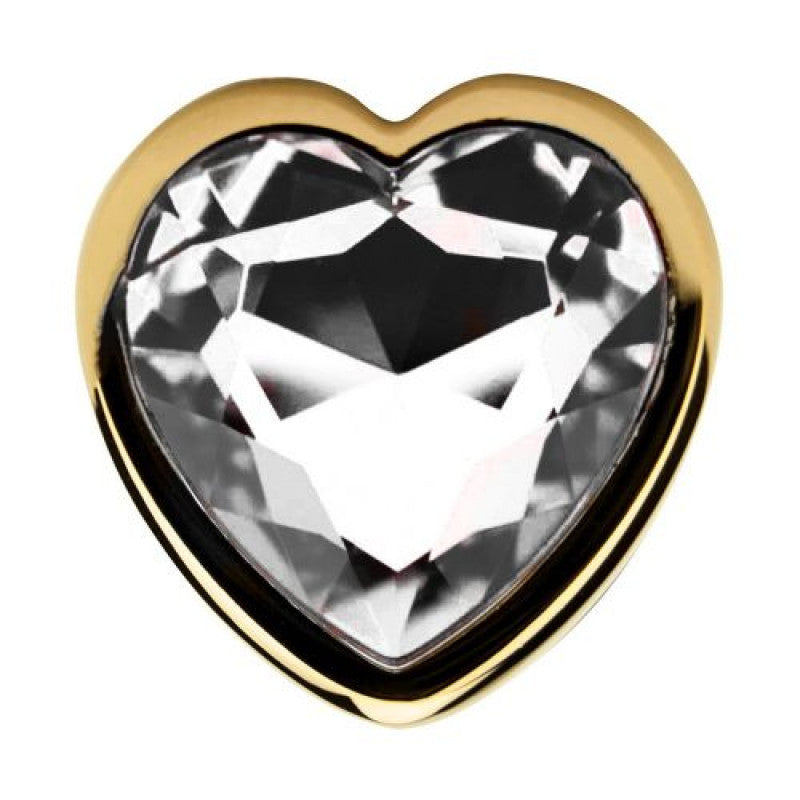 Plug anale in alluminio laccato oro con un gioiello a forma di cuore incastonato alla base. Punta arrotondata per un graduale inserimento, facile presa e maneggevolezza. Totalmente liscio e con classica forma a goccia.