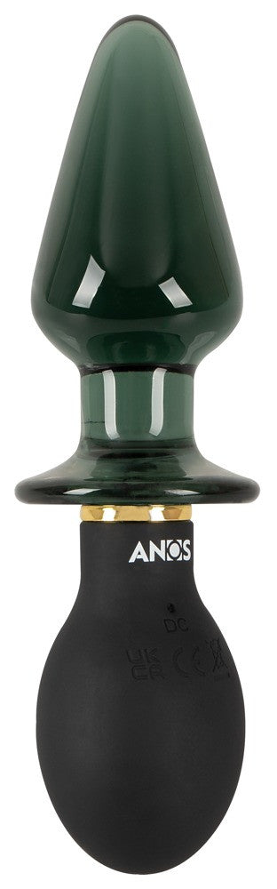 Butt plug a doppia estremità con vibrazione di ANOS in un mix di materiali di alta qualità che combina tutti i vantaggi di un silicone e di un vibroplug in vetro. Giocabile analmente da entrambi i lati: un lato con plug arrotondato in silicone morbido come la seta, l'altro con plug in vetro liscio e affusolato. Il centro affusolato è dotato di un ampio tappo che impedisce in modo sicuro lo scivolamento del plug.