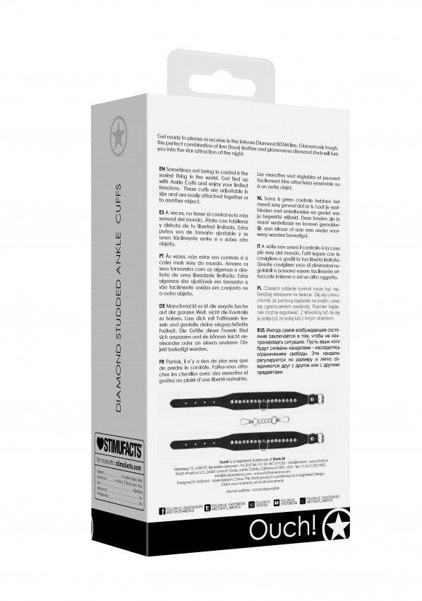 Preparati a dare piacere o riceverlo nell'intensa linea BDSM Diamond. Resistente e alla moda, la perfetta combinazione di solida (finta) pelle e borchie di diamanti eleganti ti trasformerà nell'attrazione principale della notte. A volte non avere il controllo è la cosa più sexy del mondo. Fatti legare con le cavigliere e goditi la tua libertà limitata. Queste cavigliere sono di dimensioni regolabili e possono essere facilmente attaccate insieme o ad un altro oggetto. L'aggiunta perfetta ad un problema molto eccitante: è ora di liberare il tuo lato oscuro.