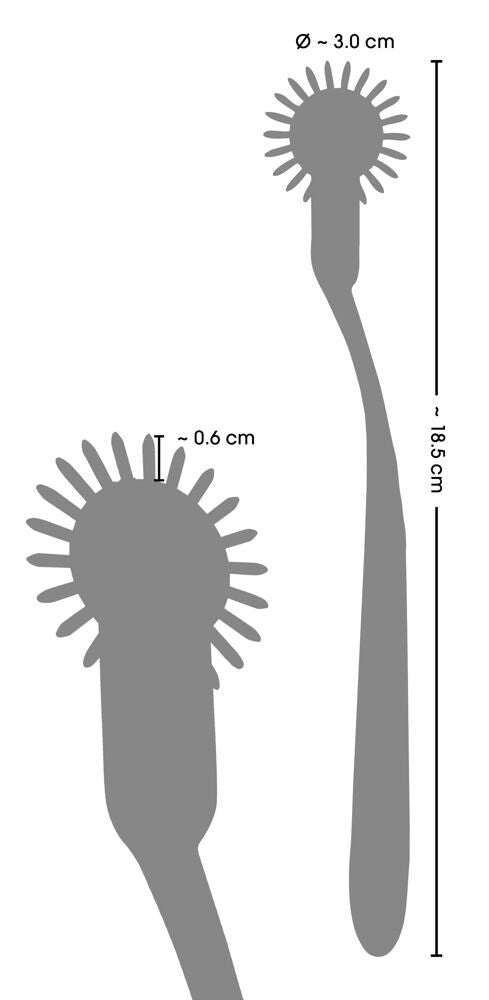 Colpisce il nervo scoperto del sesso! Robusta girandola metallica Rainbow Single Pinwheel della collezione fetish in scintillanti colori arcobaleno. Viene fatta rotolare sulla pelle con maggiore o minore pressione, provocando sensazioni delicatamente stimolanti o un intenso e piacevole dolore. La ruota è costellata di piccoli aghi molto affilati e può essere utilizzata in qualsiasi punto del corpo. L'impugnatura lunga e stretta si adatta comodamente alla mano e garantisce una guida ottimale e una pressione variabile e facile da applicare.