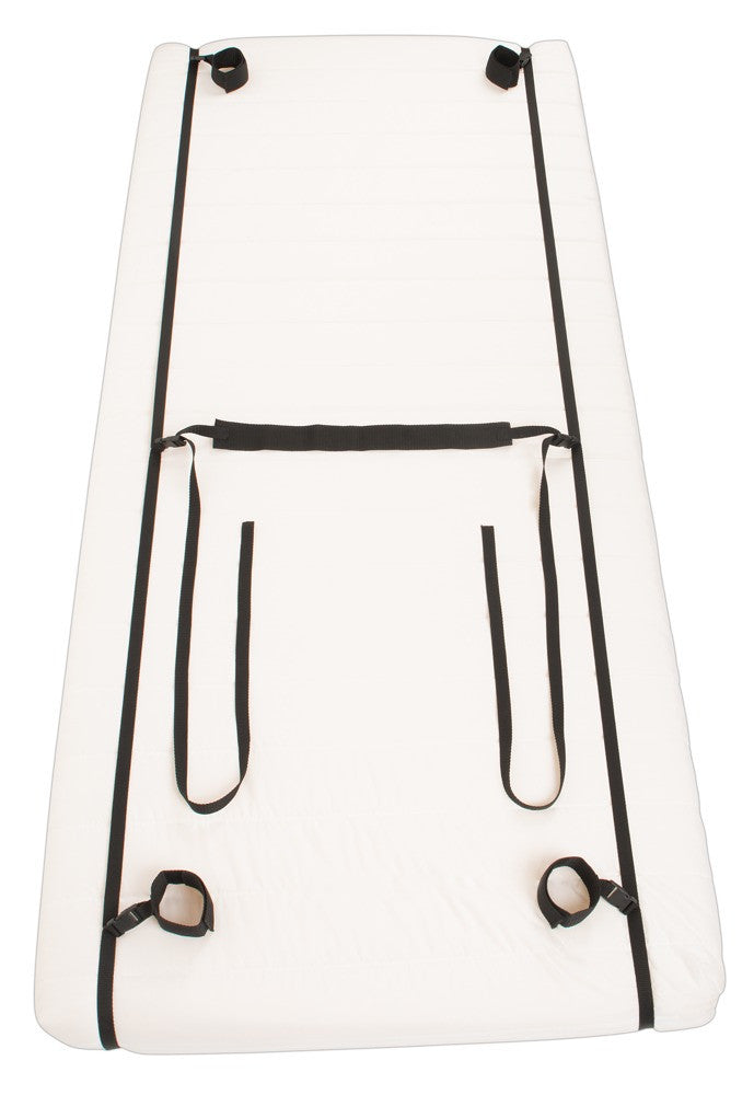 Cinghie da letto/porta ciascuna lunga 5,80 m (regolabile); cinghia in vita lunga 3 m (regolabile), rinforzata al centro lunga 50 cm; polsini di contenimento larghi 5 cm, lunghi 32 cm, regolabili con velcro. PP, PS.
