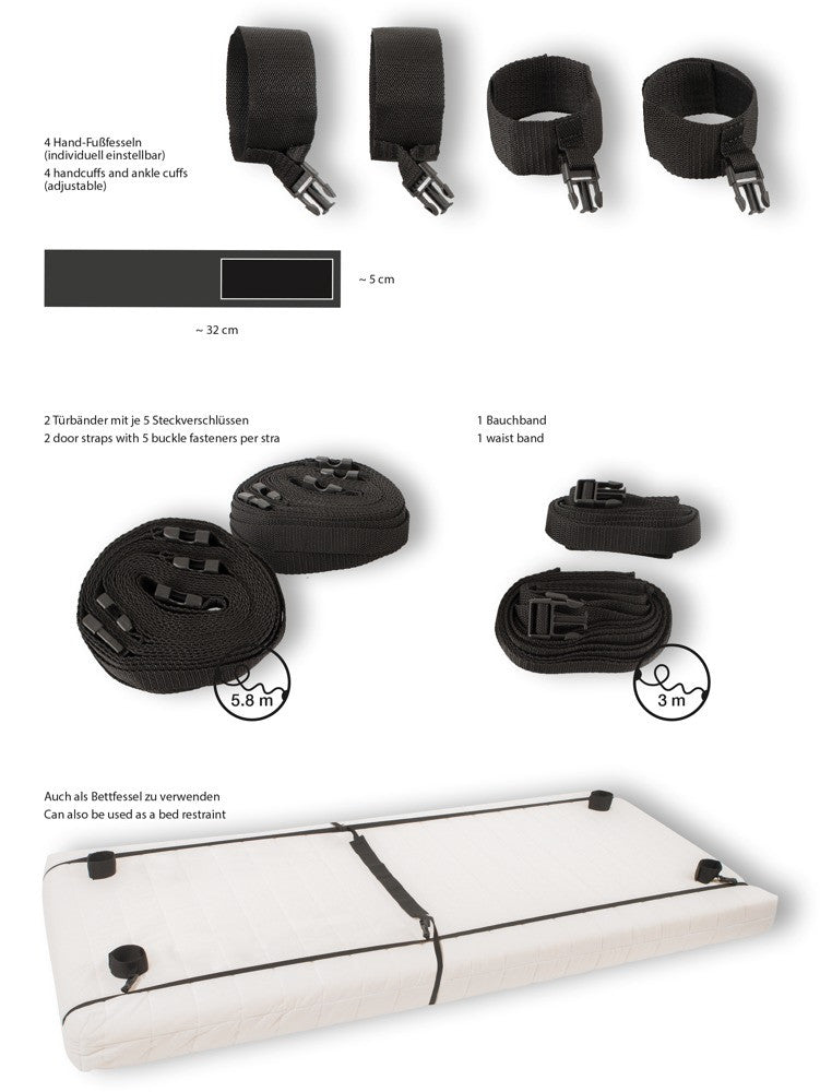 Per un eccitante bondage sul letto o sulla porta! Con questo set di costrizioni per porte e letti di Bad Kitty, qualsiasi letto o porta può essere trasformato in un parco giochi bondage professionale. Non importa se a casa o in viaggio. Il set consiste in 2 cinghie lunghe, 1 cinghia in vita e 4 cinghie per mani e piedi. Le cinghie regolabili e resistenti allo strappo si adattano alla lunghezza di qualsiasi materasso o porta. La cintura addominale regolabile e le cinghie per mani e piedi sono poi bloccate alle sei chiusure a scatto delle due cinghie. I comodi polsini per le mani e le caviglie sono dotati di pratiche chiusure in velcro e possono quindi essere regolati per adattarsi a LEI o a LUI.