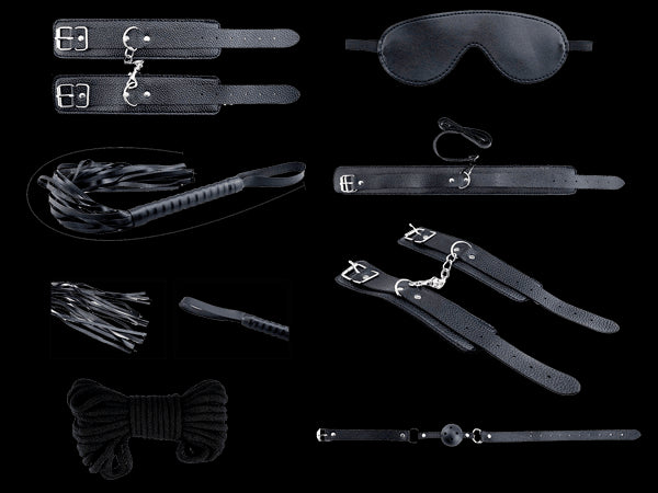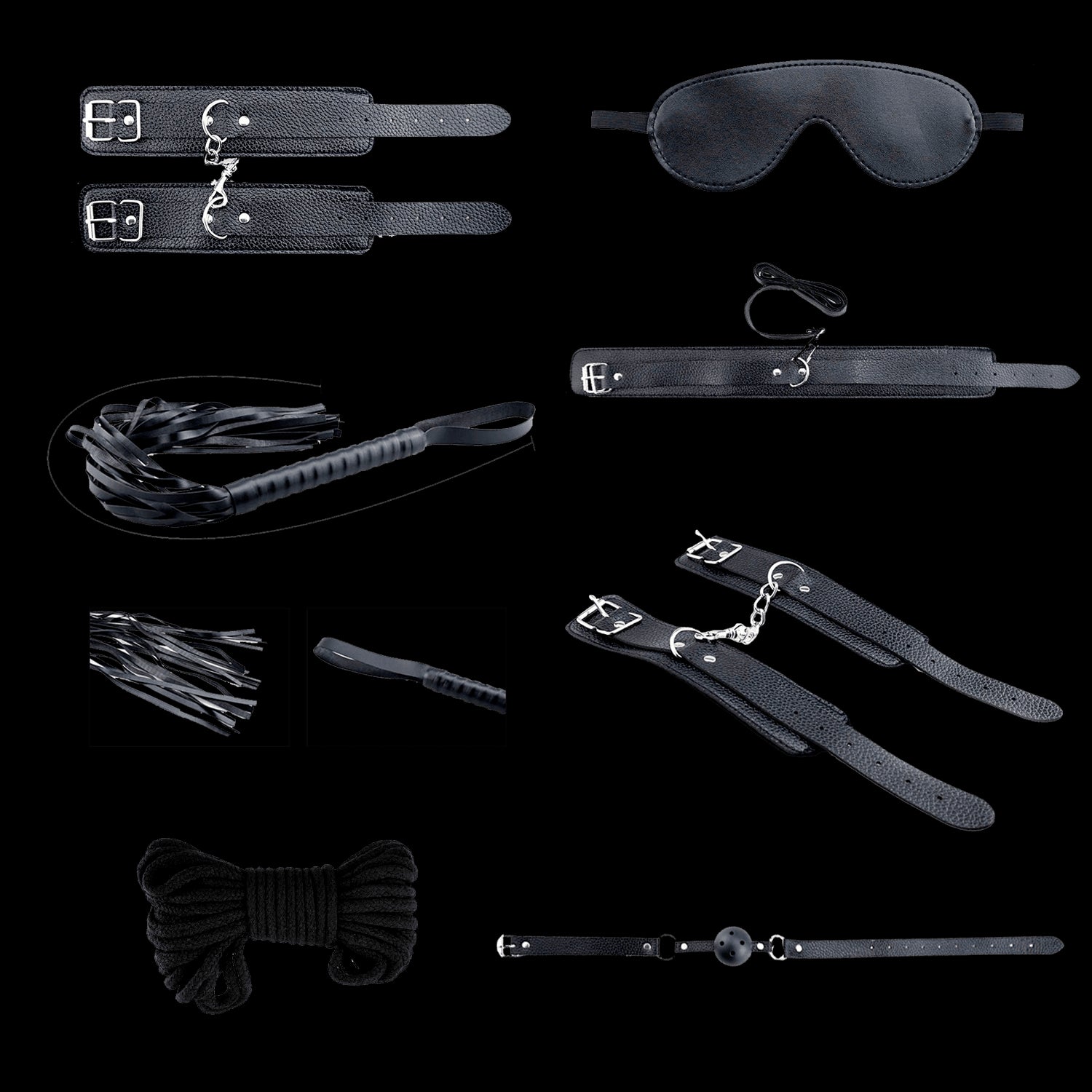 Kit BDSM da 8 pezzi: 1 manette, 1 polsini per caviglie, 1 collana + 1 guinzaglio, 1 bavaglio, 1 fustigatore, 1 maschera, 1 corda shibari