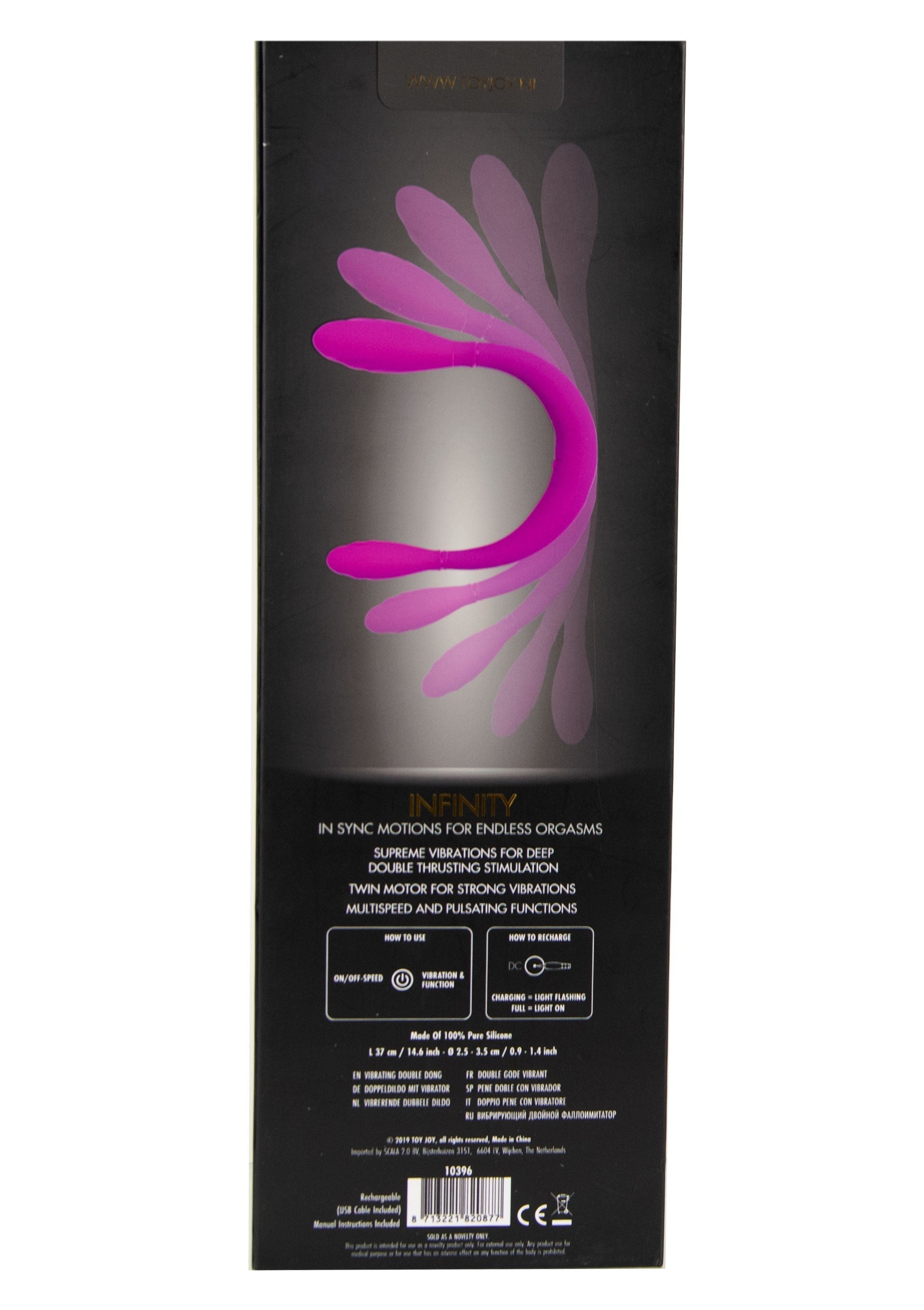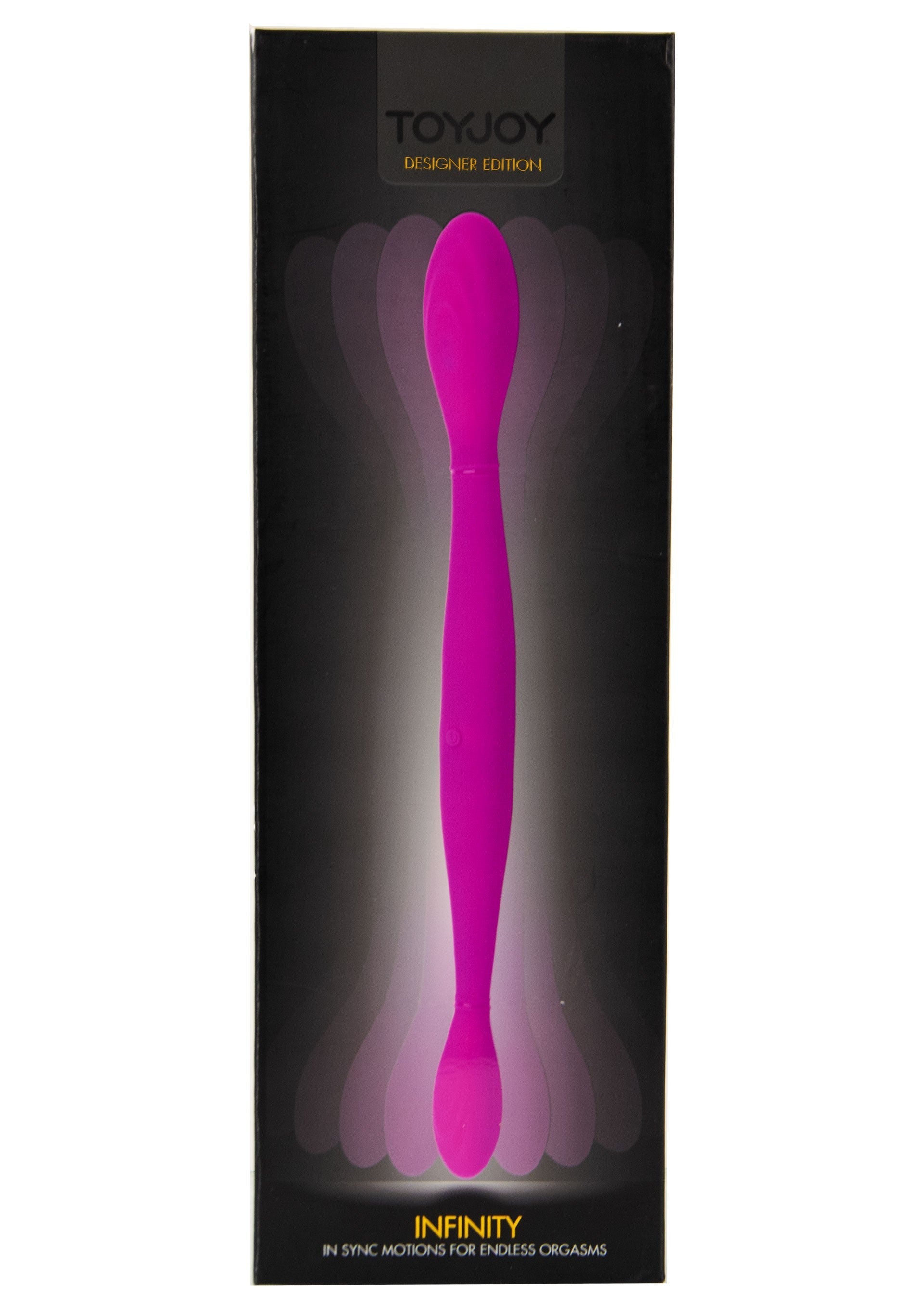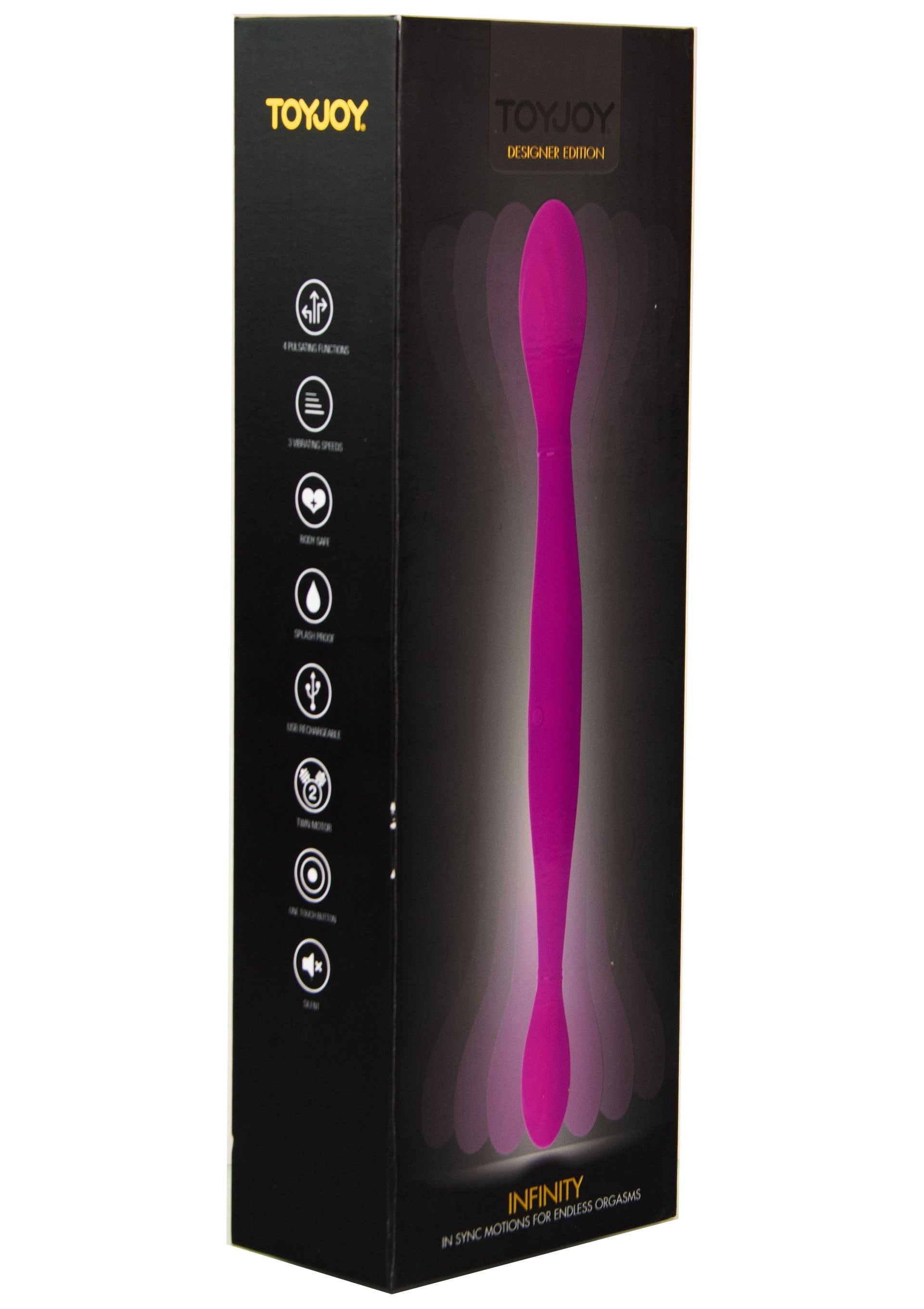 The Infinity Double Dildo di TOYJOY Designer Edition - Movimenti sincronizzati per orgasmi infiniti. Questo elegante dildo a doppia estremità offre il doppio del divertimento intimo e un'intensa soddisfazione! Infinity offre anche movimenti sincronizzati unici, che ti consentono di utilizzare entrambe le estremità contemporaneamente per un'esperienza onnicomprensiva. Questo vibratore versatile e flessibile ha una silhouette elegante e pieghevole con una punta bulbosa ad entrambe le estremità. C'è un motore ad ogni estremità, il che significa raddoppiare le vibrazioni potenti. Il design ha 3 velocità vibranti e 4 funzioni pulsanti. Realizzato in silicone morbido al tatto e ipoallergenico, è una scelta sicura per il corpo nel piacere intimo. Infinity Double Dildo è anche USB ed è estremamente facile da usare con semplici controlli a pulsante singolo. Confezionato in una lussuosa scatola che può essere utilizzata per la conservazione negli usi, nell'Infinity è un regalo perfetto per te o per un altro piacere nella tua vita.