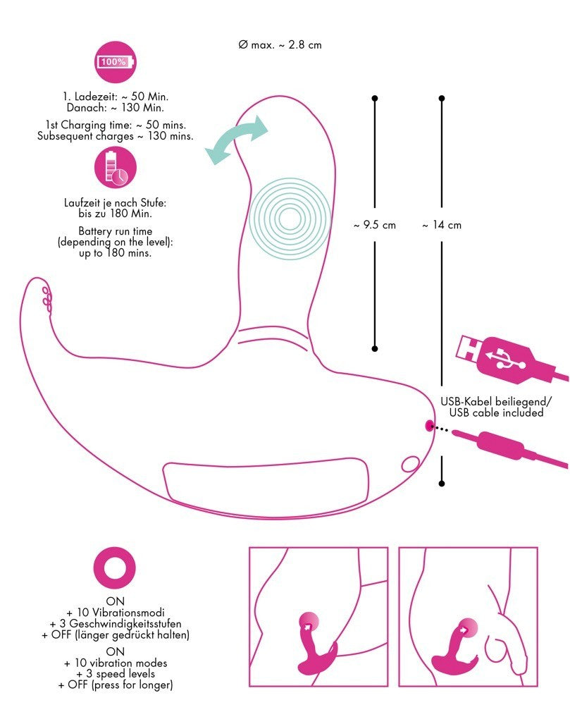 Lasciati convincere da questo vibratore rosa con un braccio stimolante e una palla toccante sulla punta - per stimolare il punto G e il clitoride o la prostata e il perineo. 8 modalità di vibrazione ti mettono anche ritmicamente in estasi. Ricaricabile con il cavo USB incluso