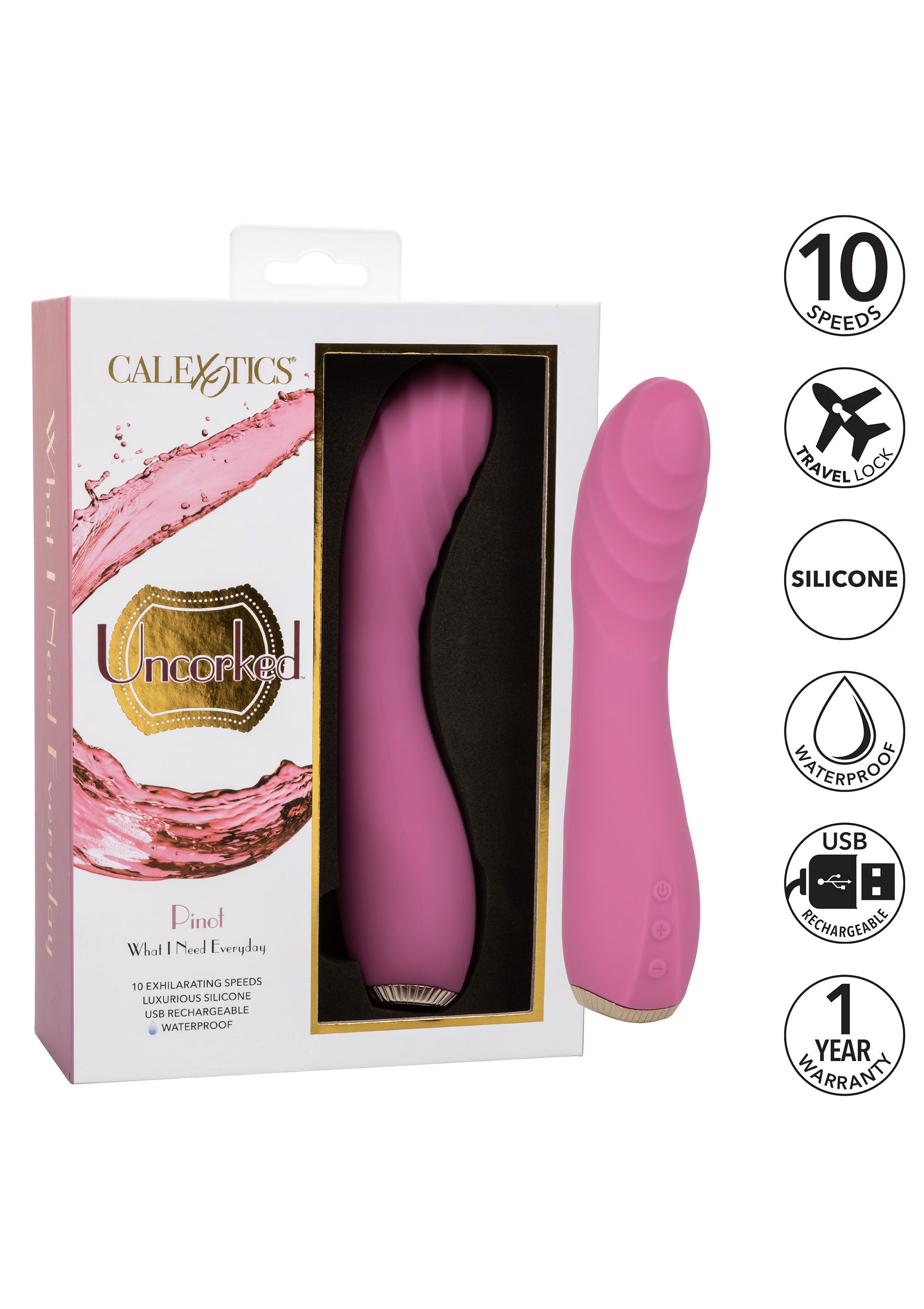 Dalla vita del jet-set al trambusto dell'ufficio, Uncorked ™ Pinot sa esattamente ciò di cui hai bisogno dopo una lunga giornata. Questo massaggiatore profondamente soddisfacente ha curve deliziose e una consistenza increspata per sensazioni piacevoli. Il vibratore in silicone peluche è dotato di 10 velocità di vibrazioni sensazionali che forniscono stimoli sconvolgenti. Controlla senza sforzo il puro piacere con un pulsante di controllo facile da toccare e tieni premuto per 3 secondi per accendere o spegnere. Con una forma liscia e una superficie flessibile, sarai in grado di abbandonarti a vibrazioni elettrizzanti da qualsiasi angolazione desideri. Divertiti con un massimo di 2,5 ore di pulsazioni appassionate a ogni carica. Ricarica la tua passione in sole 2,5 ore collegando il cavo USB in dotazione alla porta di ricarica auto-sigillante sul retro del massaggiatore.