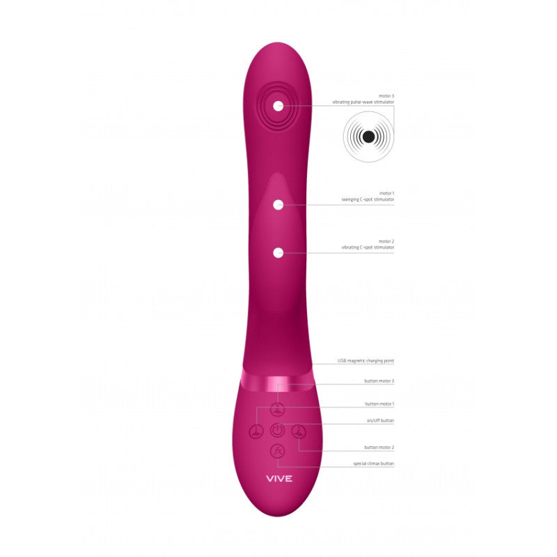 AIMI è uno dei vibratori più innovativi e potenti oggi sul mercato.Grazie ai suoi tre innovativi motori F1 di Nuova Generazione con 10 funzioni e alle sue tecnologie avanzate (tutti e tre i motori possono essere controllati in modo indipendente) è davvero il top del top!La punta vibrante contiene un motore Pulse-Wave NG F1 con 10 funzioni per la stimolazione del punto G e contiene simultaneamente un motore vibrante unico NG F1 con 10 funzioni per la stimolazione del clitoride.Vibra e si muove da un lato all'altro, quindi ti lascerà senza fiato! In totale, questo giocattolo offre 100 diverse combinazioni.Realizzato al 100% in silicone di grado medicale liscio come la seta (ipoallergenico), è totalmente impermeabile (IPX7) ed estremamente silenzioso, essendo sotto i 60 dB.Ciò significa che puoi usarlo ovunque il tuo cuore desideri.Comprende una batteria agli ioni di litio ricaricabile USB magnetica che, quando completamente carica, garantisce 40 minuti di divertimento passionale.Basta collegare, caricare e giocare!Quando ti stai avvicinando all'orgasmo, un solo tocco del pulsante della funzione speciale climax porterà immediatamente tutti i motori a piena potenza e, cosa più importante, ti porterà a un orgasmo sconvolgente.Tutti i vibratori VIVE hanno una garanzia completa di 1 anno per proteggere il tuo investimento.