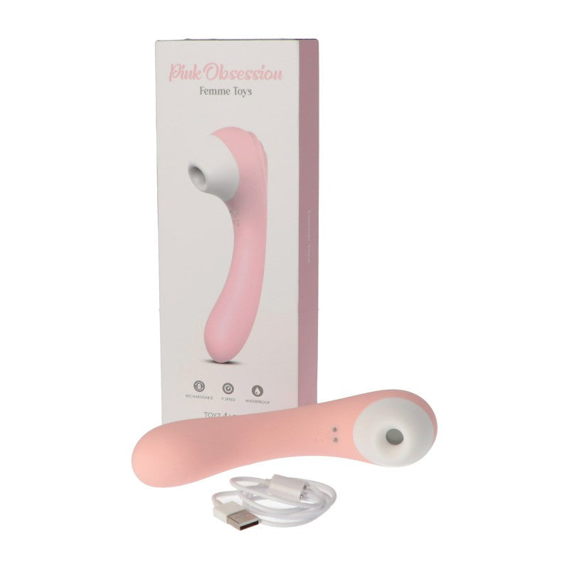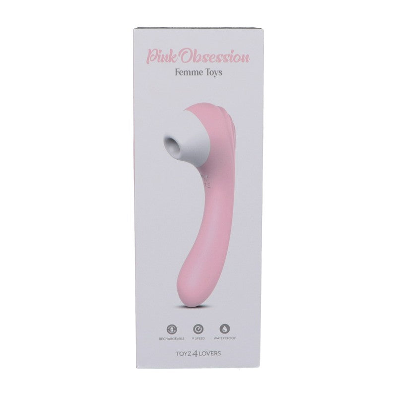 Stimolatore clitorideo a suzione del marchio Toyz4Lovers, capace di stimolare il clitoride grazie alla tecnologia a pressione d'aria. Anche il manico può essere inserito nelle parti intime donando piacere grazie ai 9 livelli di vibrazione. Design unico ed accattivante, pratica ed ergonomica presa che permette di raggiungere i punti desiderati con estrema facilità. 9 modalità di suzione diverse selezionabili e combinabili con le vibrazioni. lo stimolatore clitorideo Pink Obsession è Piacevolmente silenzioso e discreto e dalle gentili dimensioni, Ricaricabile tramite cavo USB magnetico in dotazione. 100% impermeabile.