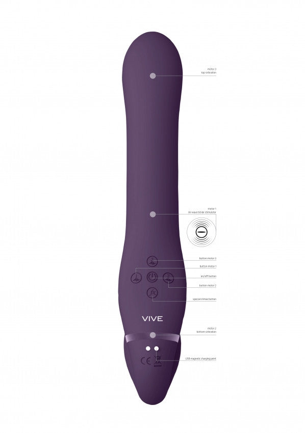 Lo strap-on strapless VIVE047 per punto-G con tecnologia a onde d'aria sicuramente offre il meglio su entrambe le estremità. Tre motori di Nuova Generazione F1 a 10 velocità/funzioni di nuova generazione controllati in modo indipendente alimentano questo vibratore dal design accattivante. Il giocattolo contiene un motore con punta di vibrazione del punto G, un motore di vibrazione interno e un motore pulsante a onde d'aria stimolante il clitoride con un tickler. Con oltre 1.000 diverse combinazioni, questo giocattolo ti porterà in luoghi mai immaginati. Quando ti avvicinerai all'orgasmo, un solo tocco del pulsante della funzione speciale orgasmo porterà immediatamente tutti i motori alla massima potenza/velocità. Il vibratore in silicone di grado medicale completamente ricaricabile tramite USB magnetico, vanta una durata della batteria di 45 minuti ed è totalmente impermeabile(IPX7) e ciò significa che puoi goderti questo giocattolo ovunque tu voglia. Tutti i vibratori VIVE hanno 1 anno di garanzia.
