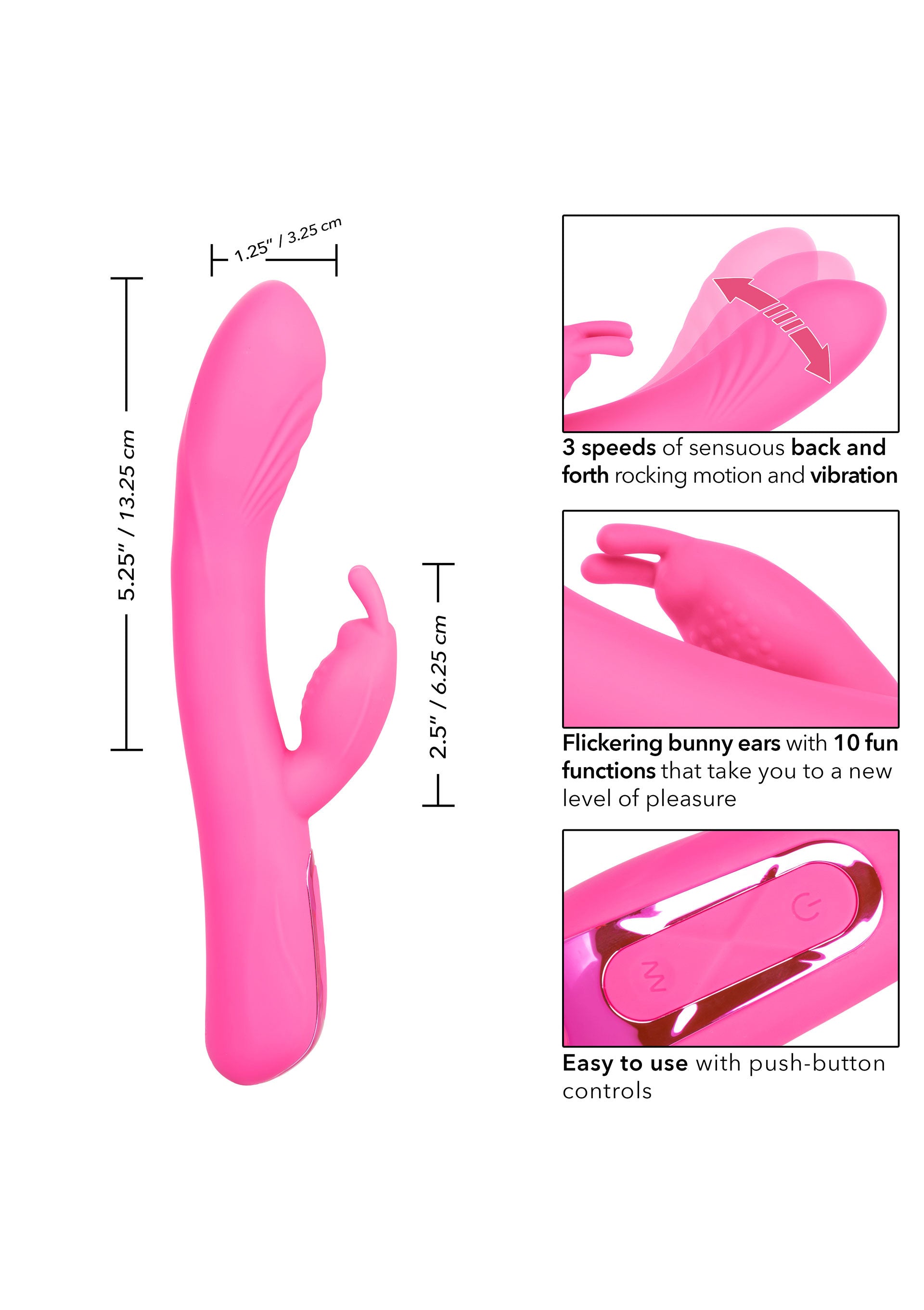 Il lussuoso Jack Rabbit dà vita a fantasie eccitanti con il sensazionale Elite Rocking Rabbit. Questo massaggiatore dal design accattivante è dotato di 10 funzioni di vibrazione e di 3 velocità di massaggio del punto g per un'esperienza di piacere che durerà tutta la vita. Per massimizzare e personalizzare il vostro piacere, il pad di controllo a 3 pulsanti, facile da toccare, vi permette di azionare in modo indipendente la pletora di vibrazioni e le opzioni di oscillazione avanti e indietro della punta. Mentre lo stimolatore a coniglietto sfarfalla, la punta ricurva vibra e oscilla avanti e indietro per un'eccitante stimolazione del punto g. La sensuale punta vibrante ha una potente azione dondolante per assicurarvi di colpire sempre il punto giusto. Le orecchie e il naso svolazzanti di questo incantevole coniglietto ospitano un potente motore di vibrazione che offre una stimolazione esterna da urlo. Le vibrazioni morbide e flessibili possono essere utilizzate indipendentemente dalla funzione di dondolio, per un'esperienza di piacere personalizzabile. La porta di ricarica autosigillante consente di ricaricare la passione in 2 ore. Utilizzate l'elegante pad di controllo a 3 pulsanti per selezionare 120 minuti di piacere appassionato.
